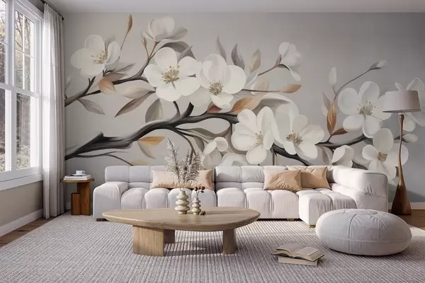 Fototapeten Ein strukturierter Ast mit weißen Blüten und braunen Blättern vor einem hellgrauen Hintergrund Nr. w09817