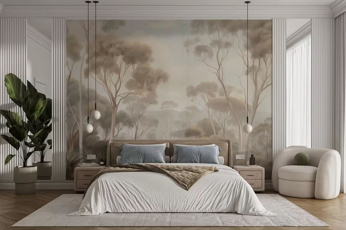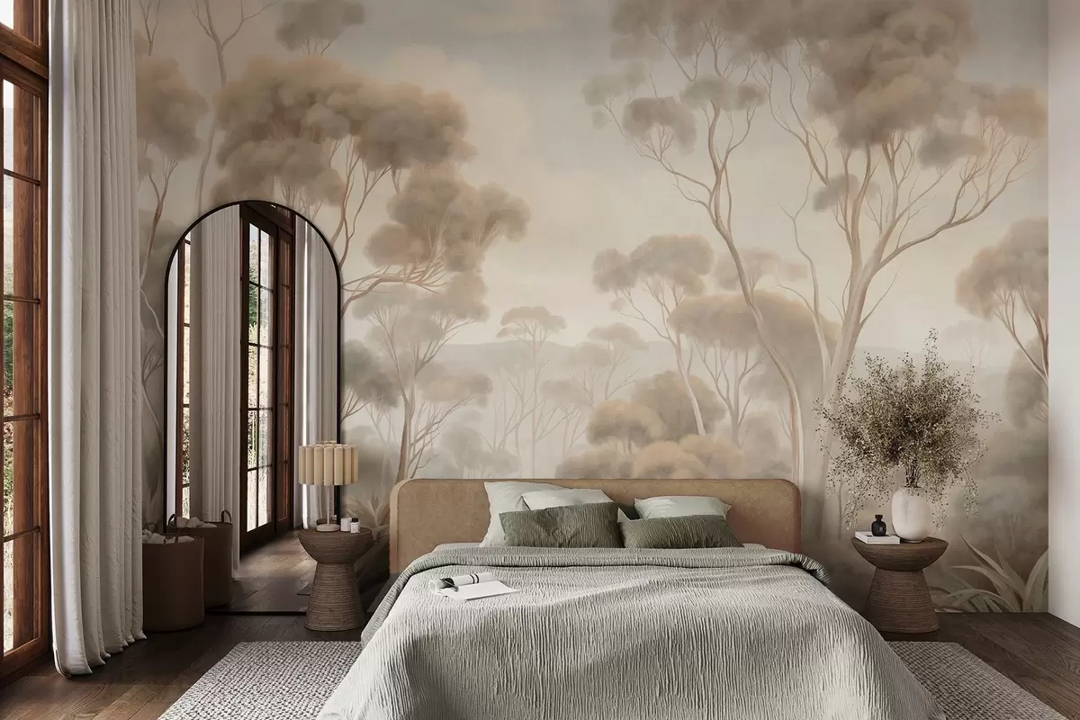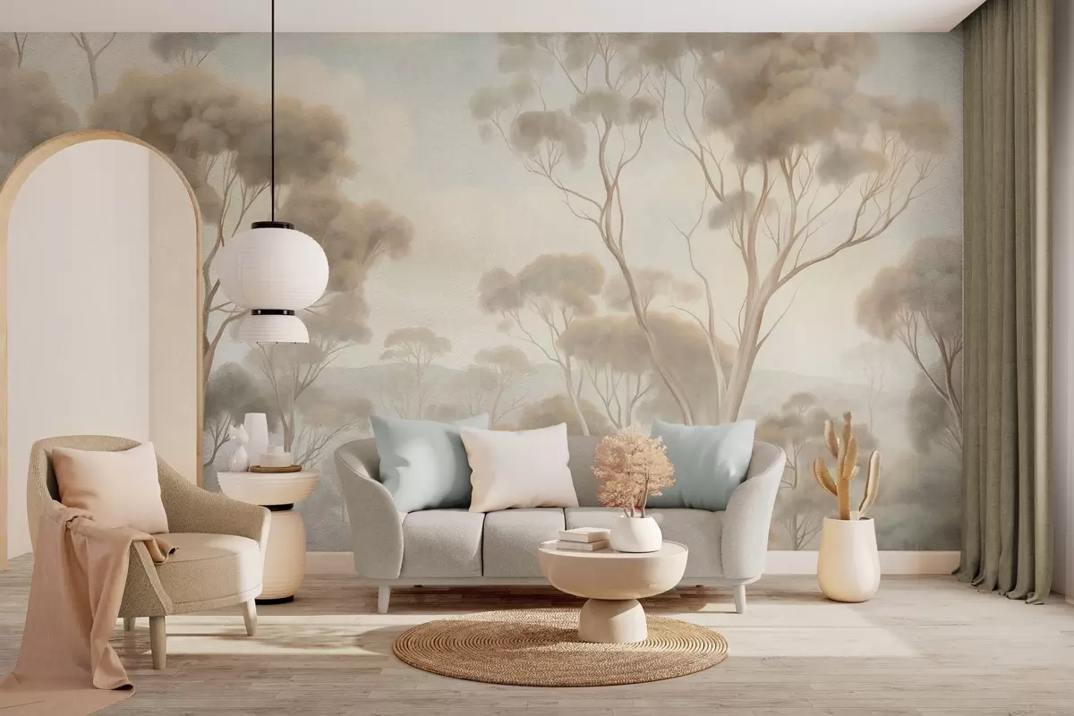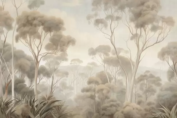 Fototapeten Eine neblige Waldlandschaft mit hohen Eukalyptusbäumen, sanften Hügeln unter bewölktem Himmel, strukturierte Grafik Nr. w09822