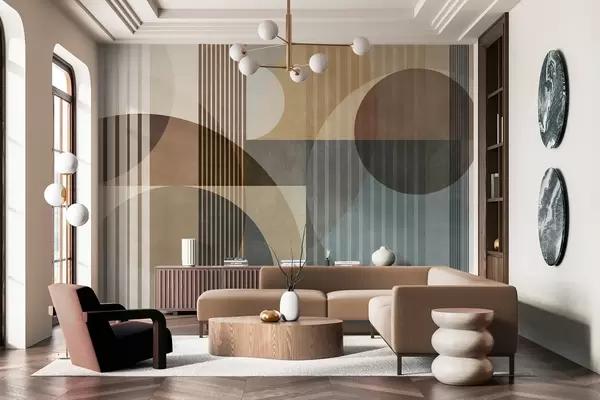 Fototapeten Abstrakte geometrische Formen aus Kreisen und Linien, gedämpfte Erdtöne, strukturierte, vielschichtige Komposition Nr. w09834