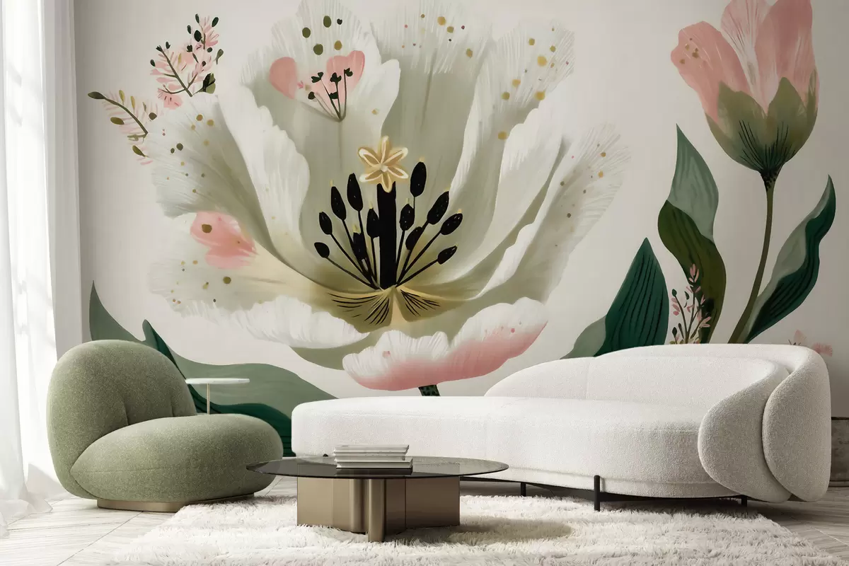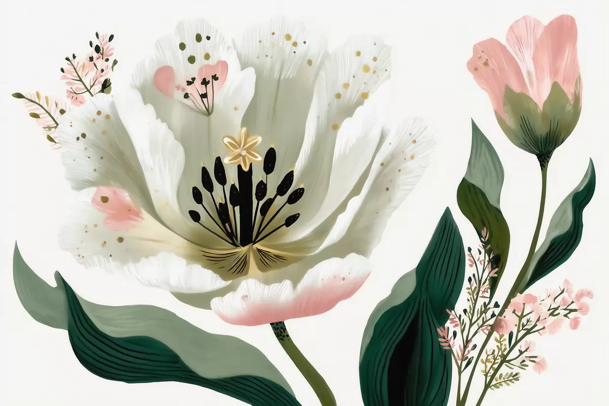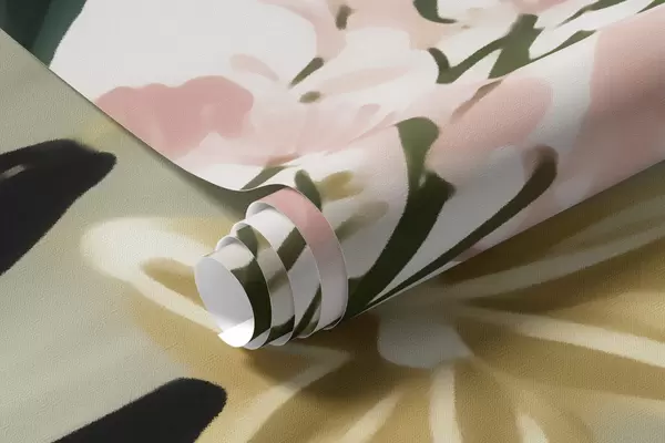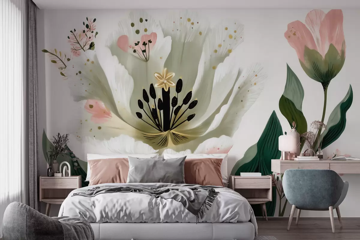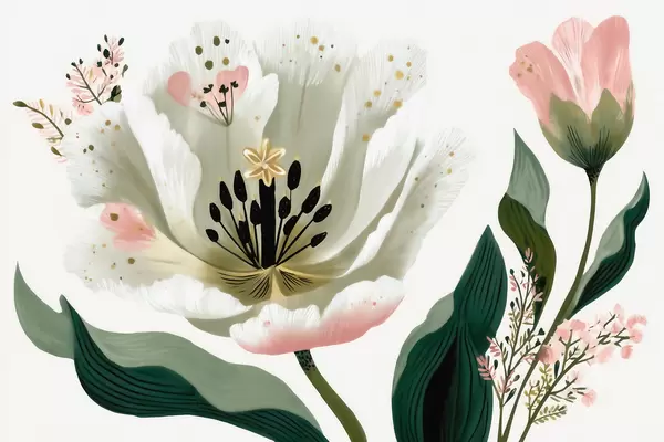 Fototapeten Eine Blume mit grünen Blättern und zartrosa Akzenten im Aquarellstil Nr. w09836