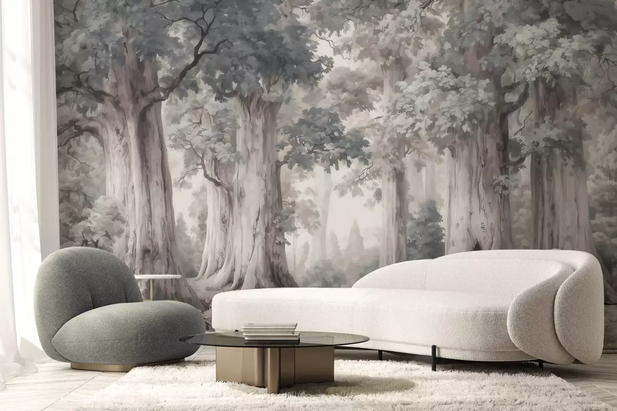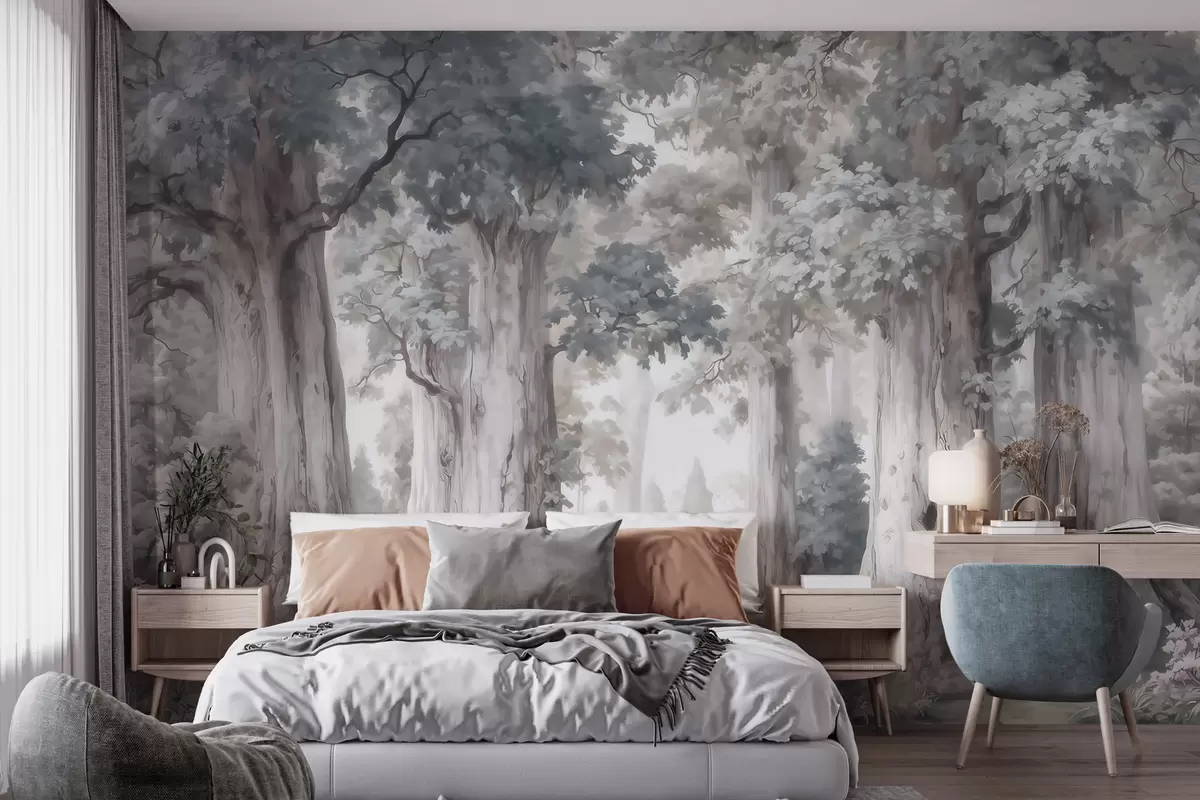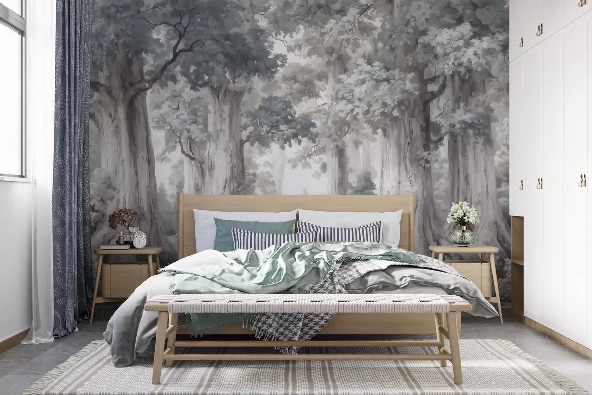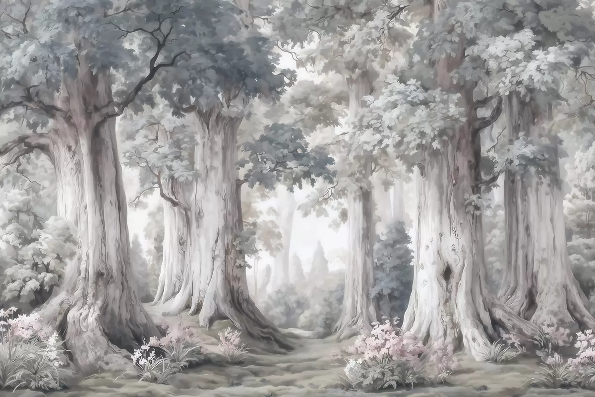 Fototapeten Ein märchenhafter Wald mit hohen Bäumen und einer sanften, gedämpften Farbpalette im Aquarellstil Nr. w09849