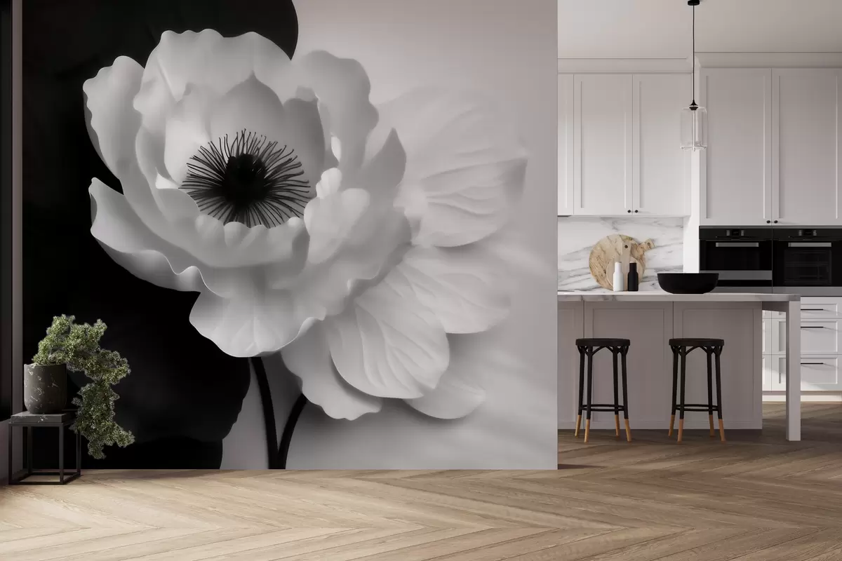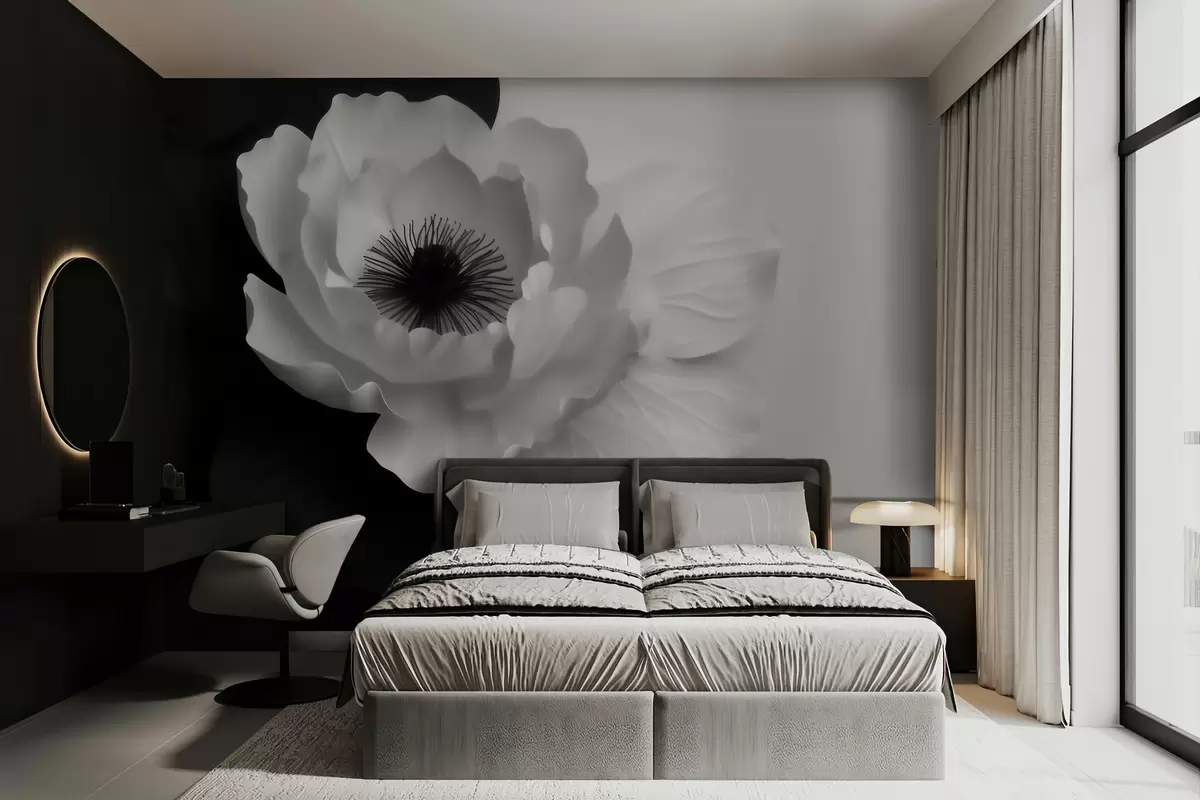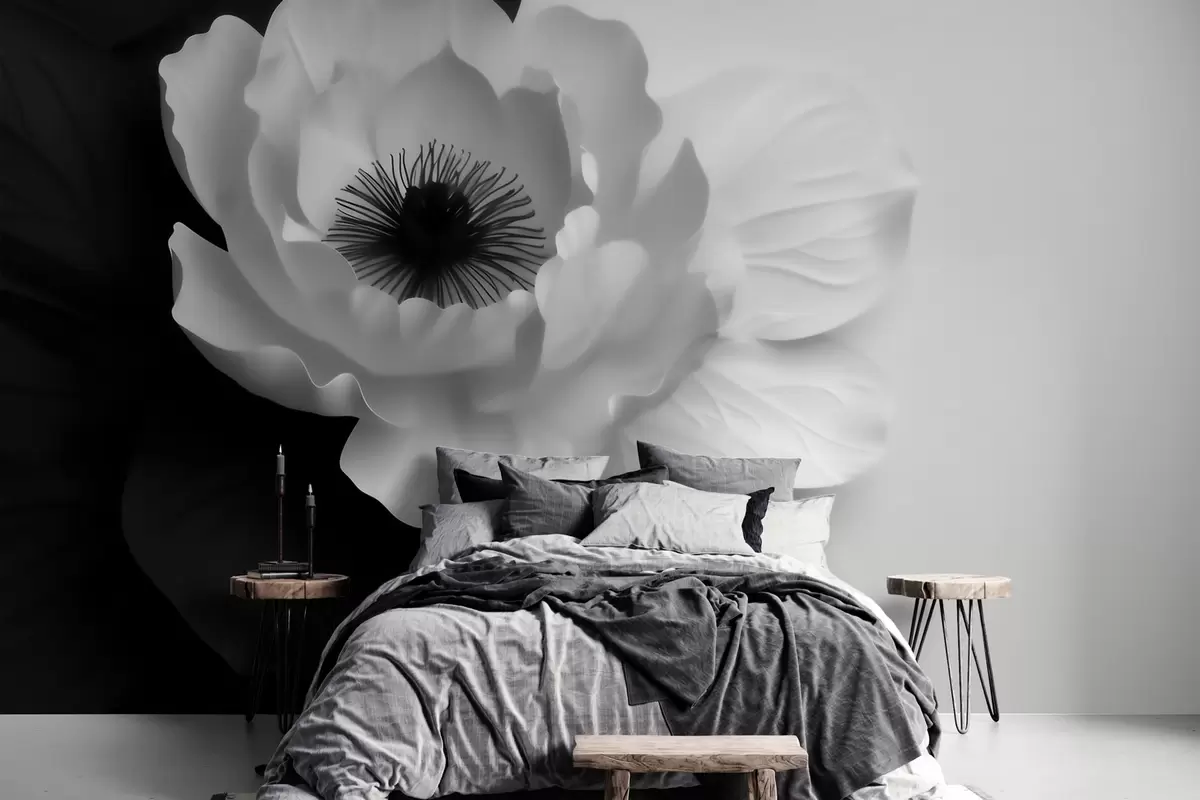 Fototapeten Eine kontrastreiche weiße Blume mit dunkler Mitte auf schwarz-weißem Hintergrund Nr. w09852