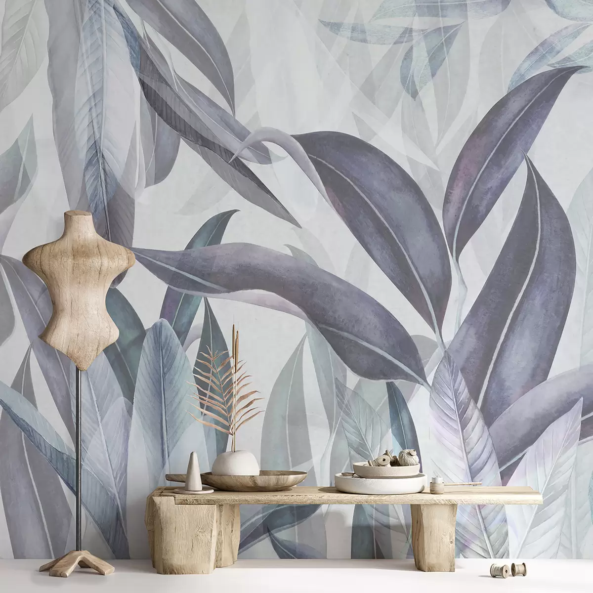 Peintures murales Feuilles de palmier vertes et roses dans des couleurs bleues Nr. u94302v1