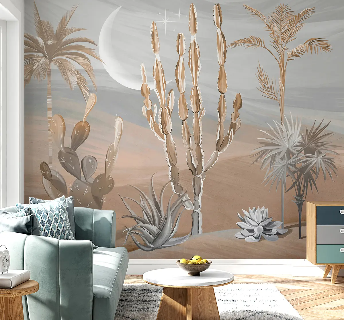 Murale 3D désert avec des cactus et des feuilles tropicales u96444