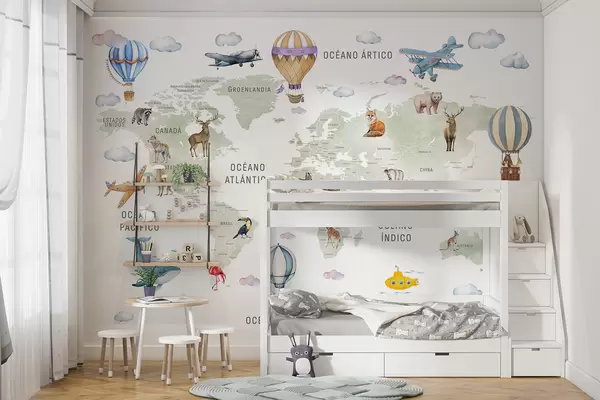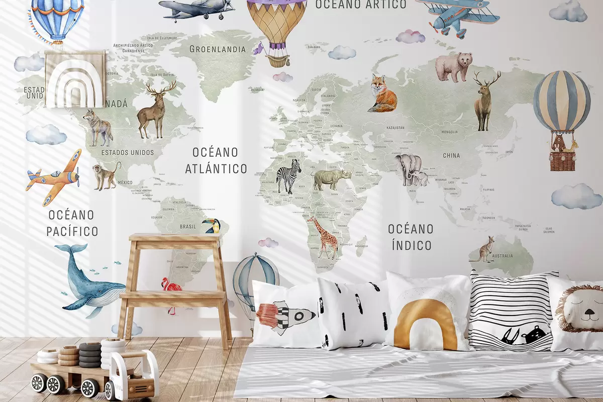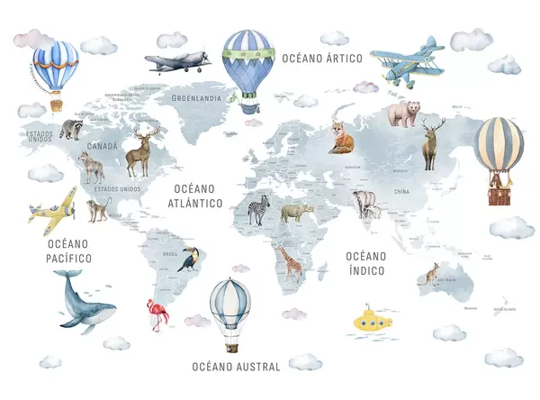 Peintures murales Carte pour enfants au style aquarelle avec des animaux et des montgolfières. En espagnol. Couleur verte. Nr. c00001es