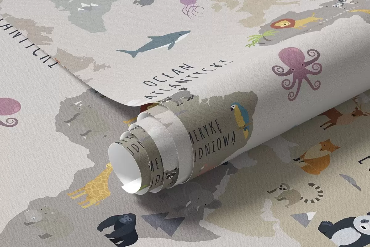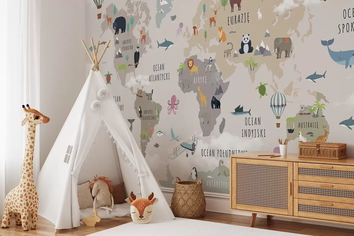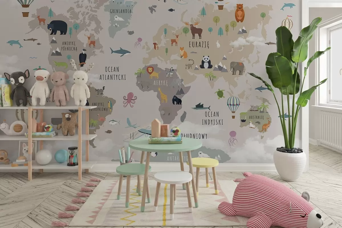Peintures murales Carte du monde pour enfants avec des animaux et des montgolfières. Langue polonaise Nr. c00002pl
