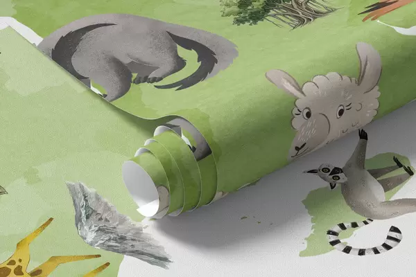 Peintures murales Une carte verte de style aquarelle représentant des animaux, des plantes et des bâtiments. Légendes en anglais Nr. c00009env2