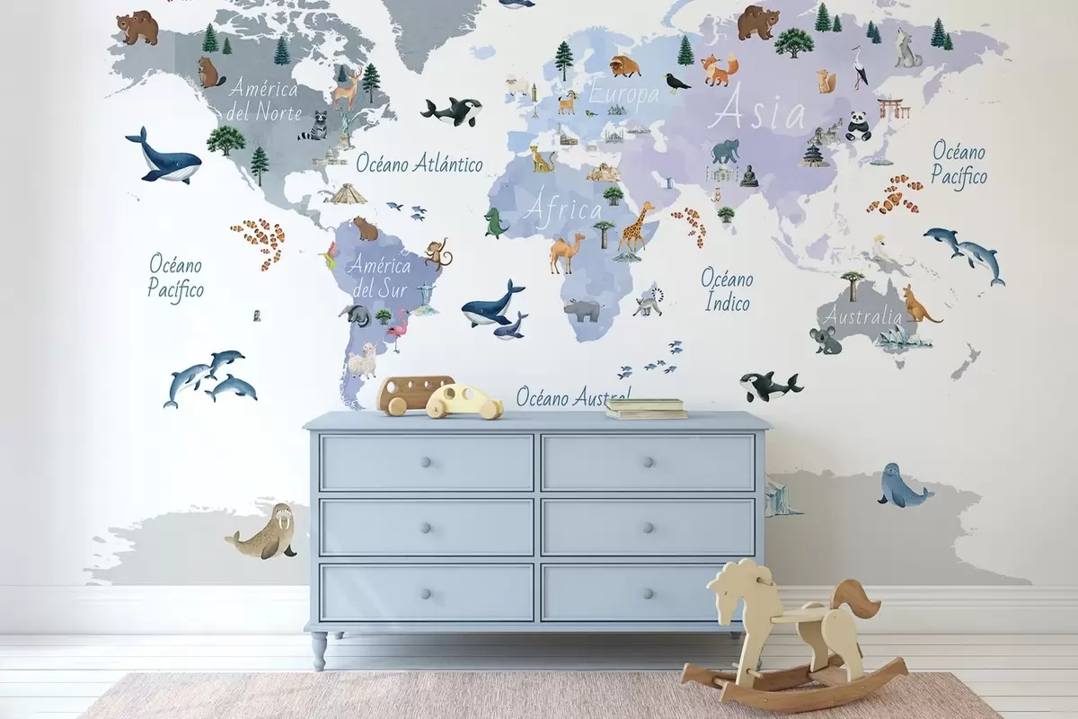 Peintures murales Une carte bleue de style aquarelle représentant des animaux, des plantes et des bâtiments. Légendes en espagnol Nr. c00009esv1