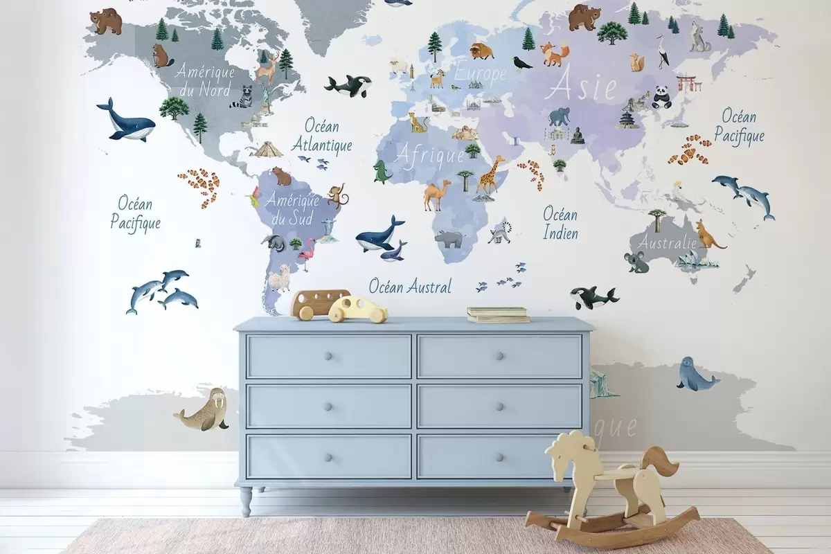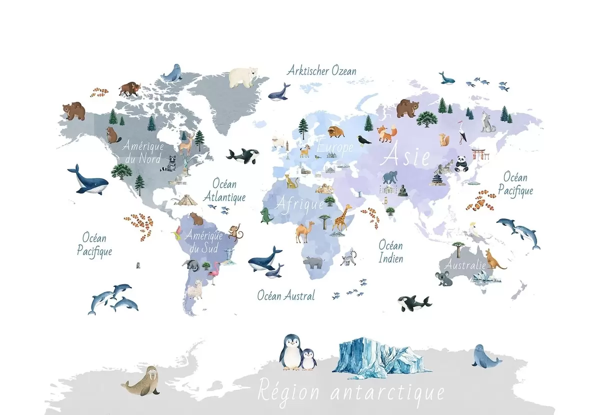 Peintures murales Une carte bleue de style aquarelle représentant des animaux, des plantes et des bâtiments. Légendes en français Nr. c00009frv1