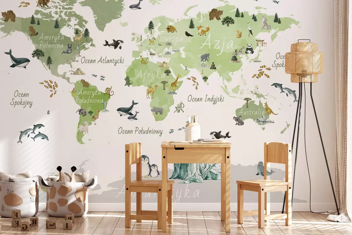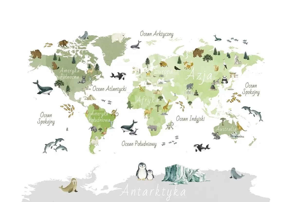 Peintures murales Une carte verte de style aquarelle représentant des animaux, des plantes et des bâtiments. Légendes en polonais Nr. c00009plv2