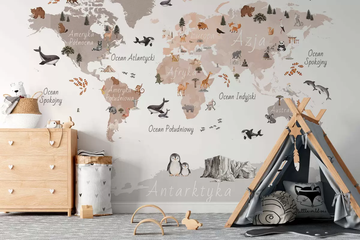 Peintures murales Une carte de couleur beige, dans un style aquarelle, représentant des animaux, des plantes et des bâtiments. Légendes en polonais Nr. c00009plv3