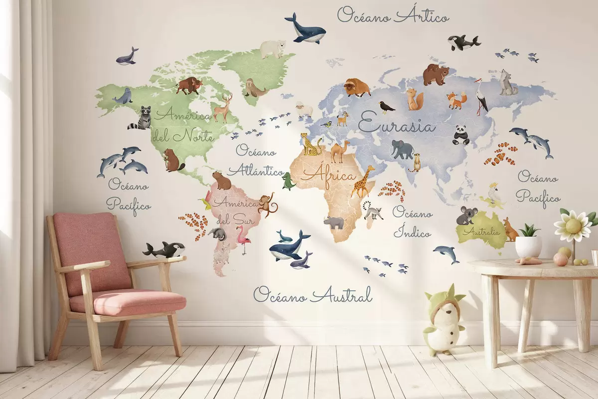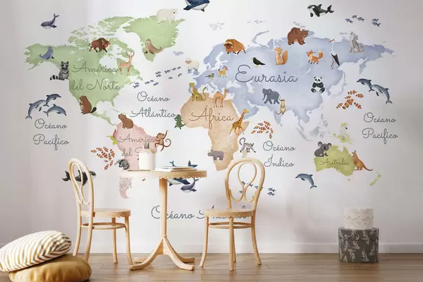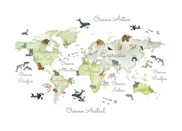 Peintures murales Une carte en couleurs de style aquarelle représentant des animaux. Légendes en espagnol Nr. c00012es