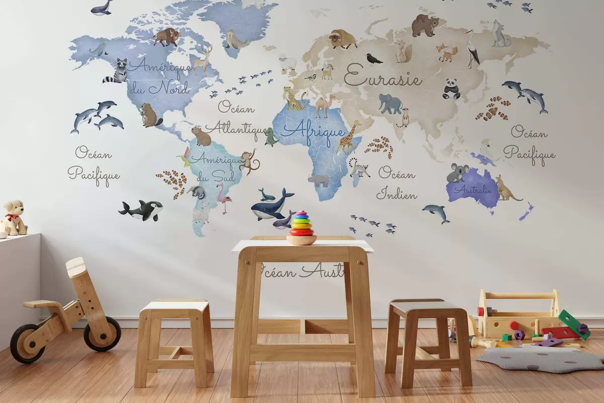 Peintures murales Une carte bleue de style aquarelle représentant des animaux. Légendes en français Nr. c00012frv1