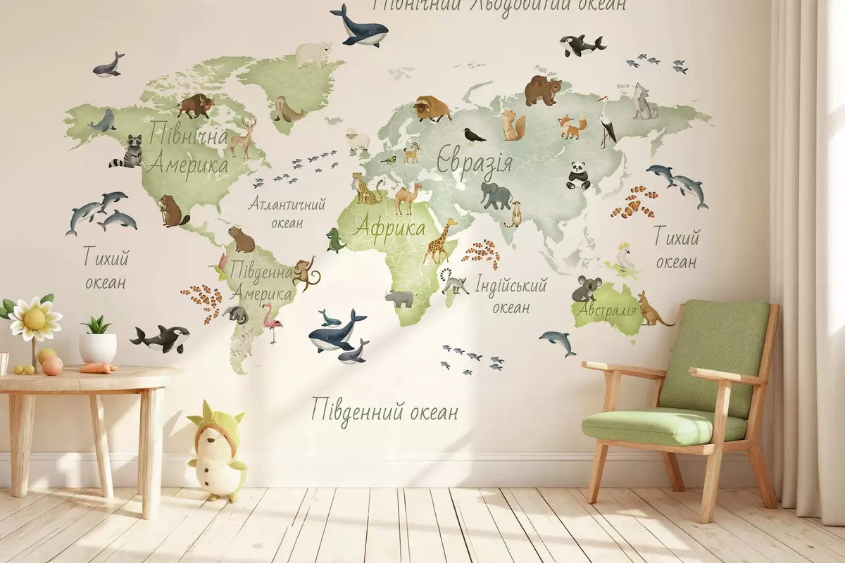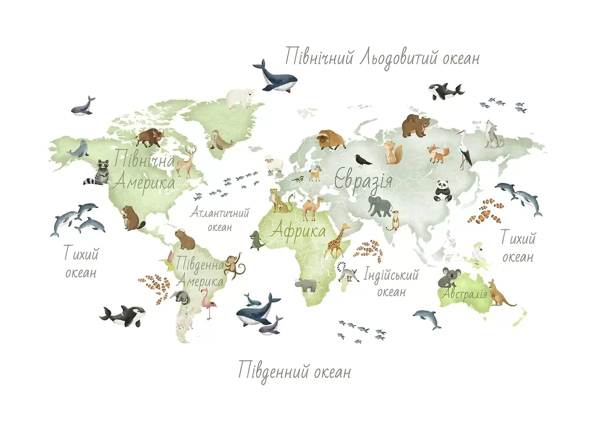 Peintures murales Une carte verte de style aquarelle mettant en scène des animaux. Légendes en ukrainien Nr. c00012ukv2
