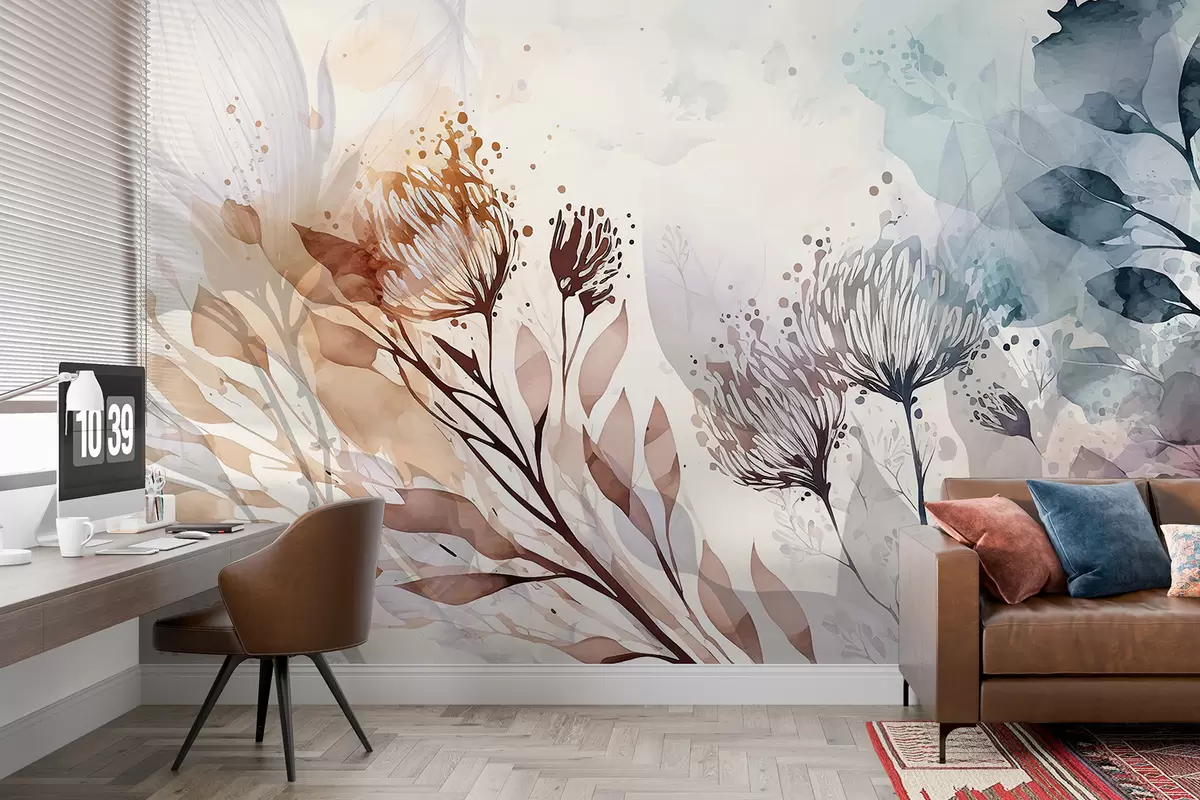 Peintures murales Résumé floral délicat, fleurs stylisées et éléments de formes végétales dans des tons atténués et terreux, aquarelle Nr. w00898