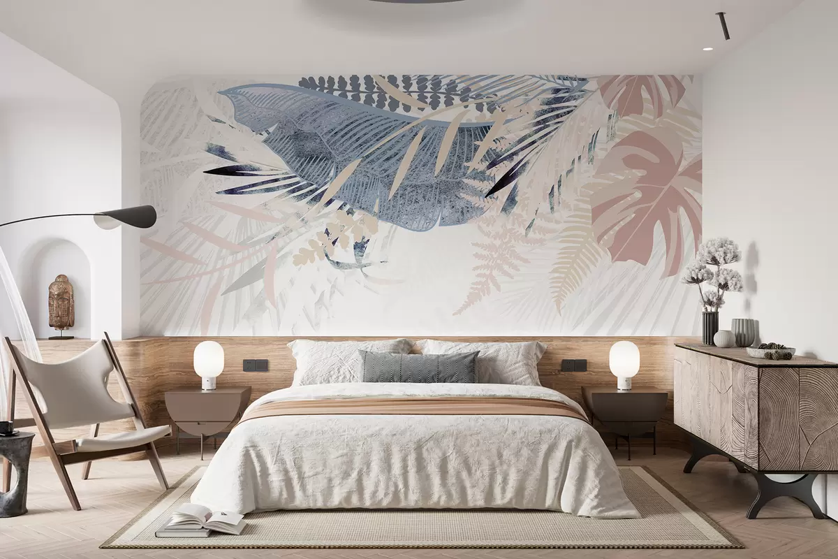 Peintures murales Motif de feuilles de palmier texturées tropicales au design botanique moderne avec diverses nuances de bleu, de gris et de rose Nr. w00908