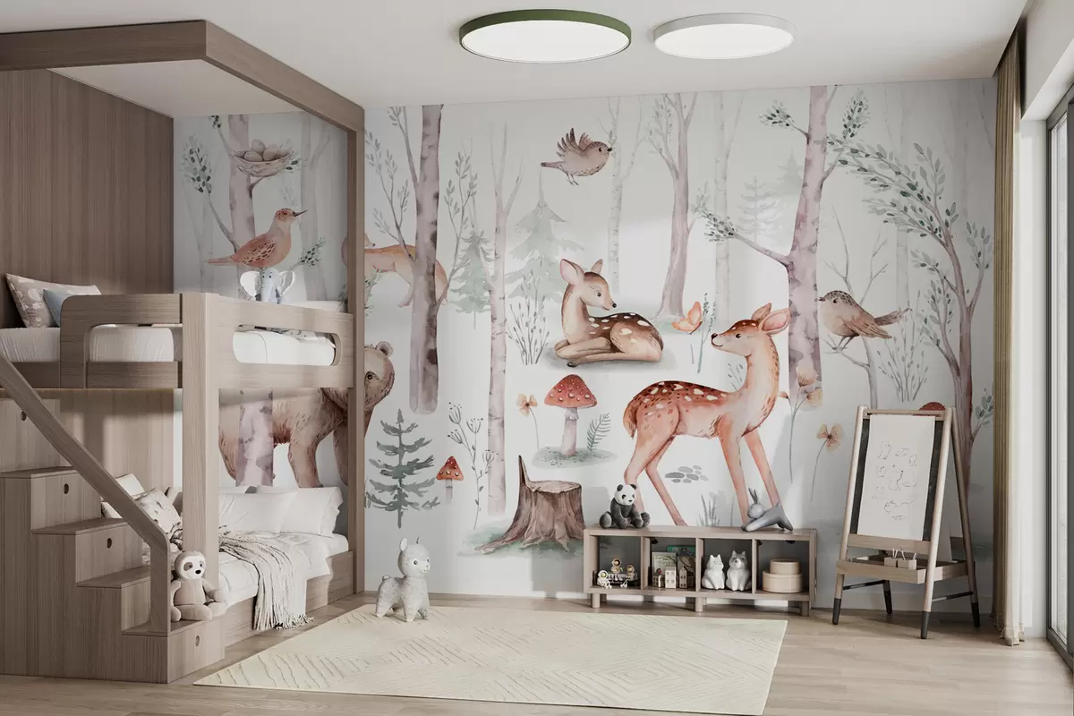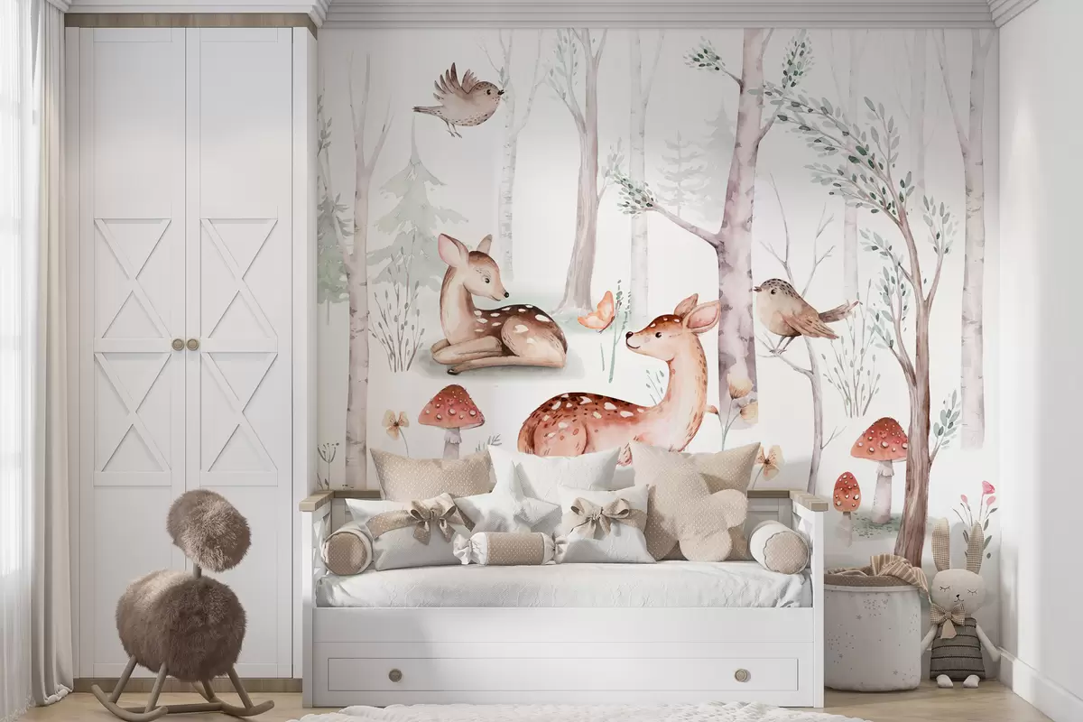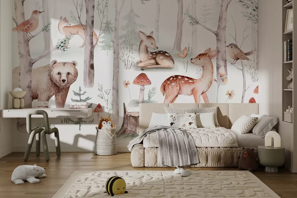 Peintures murales Papier peint pour chambre d'enfant, animaux de la forêt. Papier peint délicat de style aquarelle dans d'agréables couleurs pastel chaudes sur un fond blanc Nr. w01089