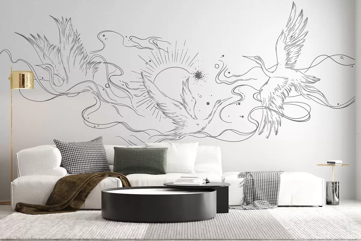 Peintures murales Oiseaux volants, dessin au trait, minimalisme, palette de couleurs grises Nr. w02022v2