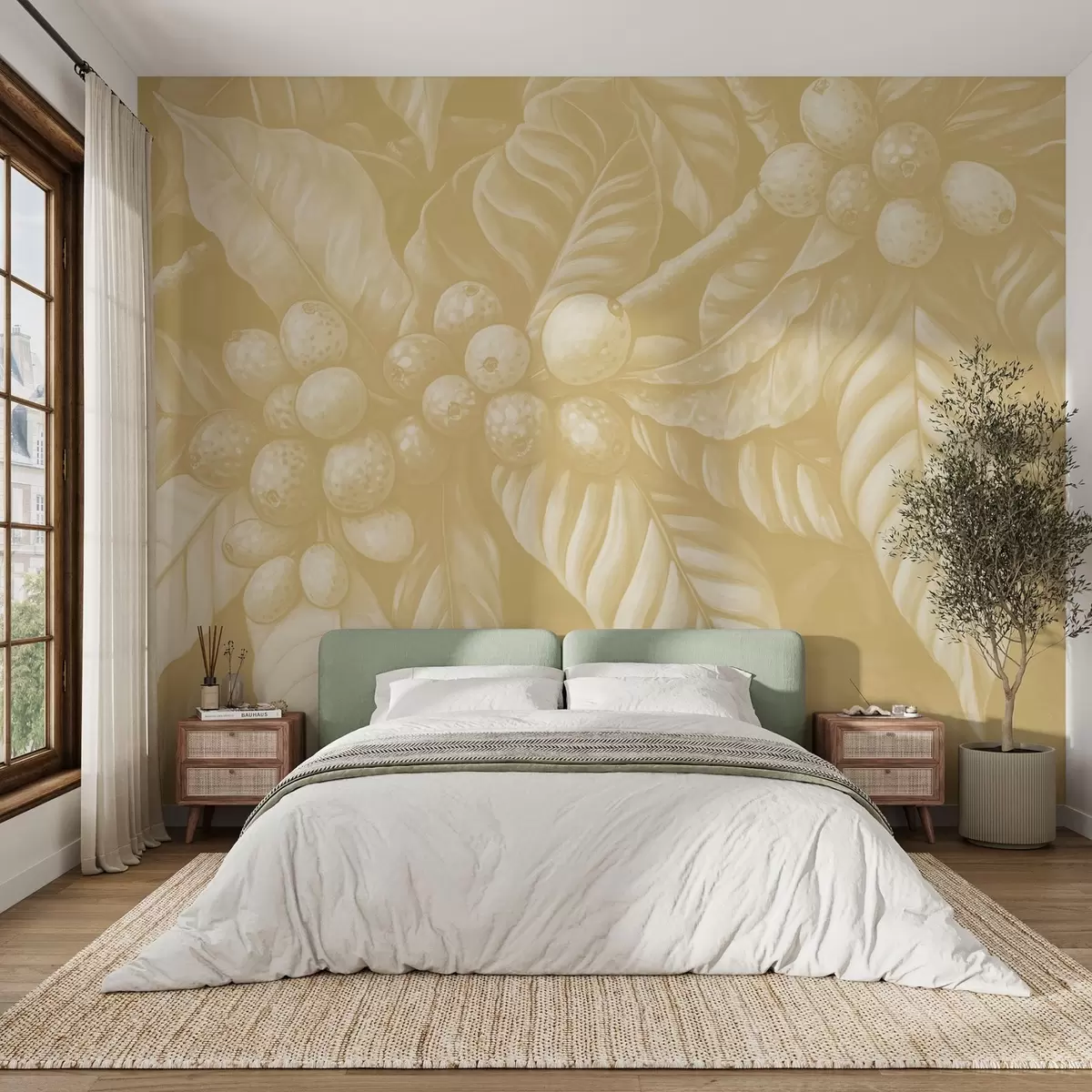 Peintures murales Branches de caféiers avec fruits et éléments tropicaux dans les tons beiges Nr. w02209v1