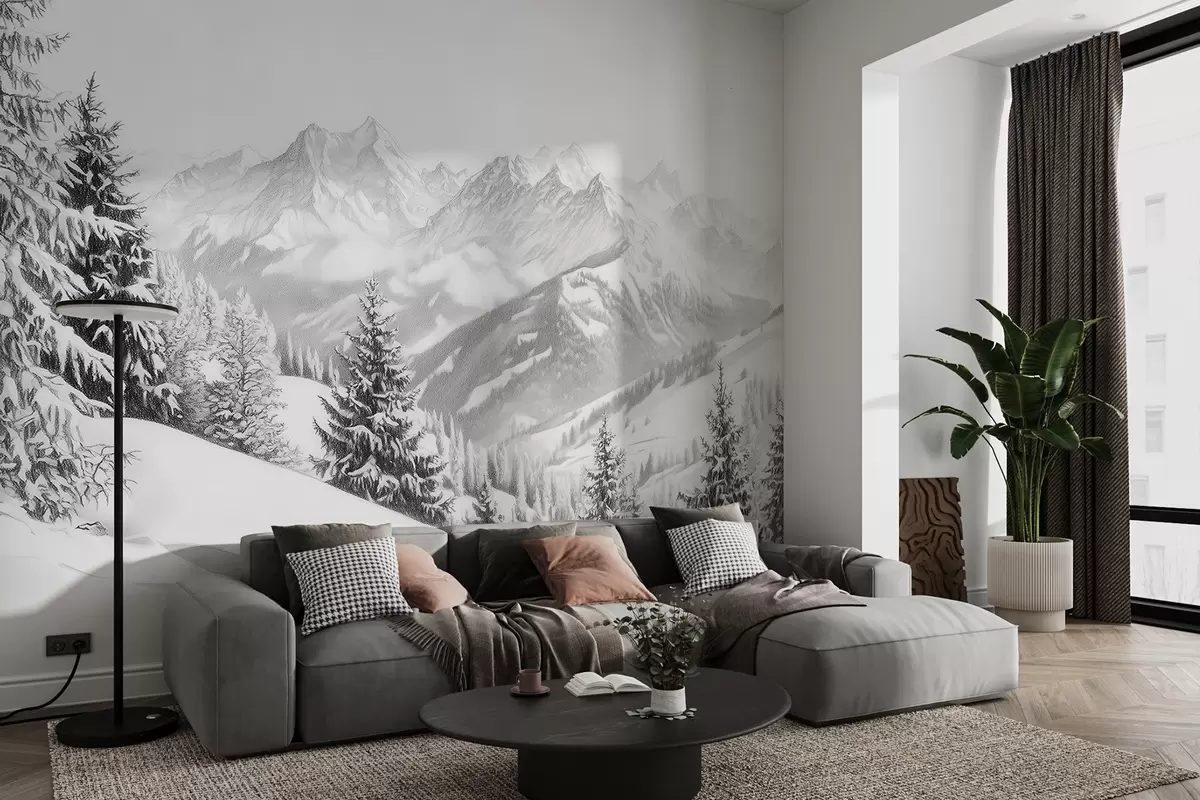Peintures murales Hiver en montagne, forêt, Alpes, dessin au crayon, paysages de nature Nr. w02353