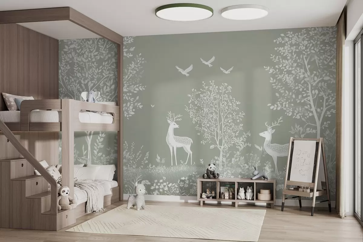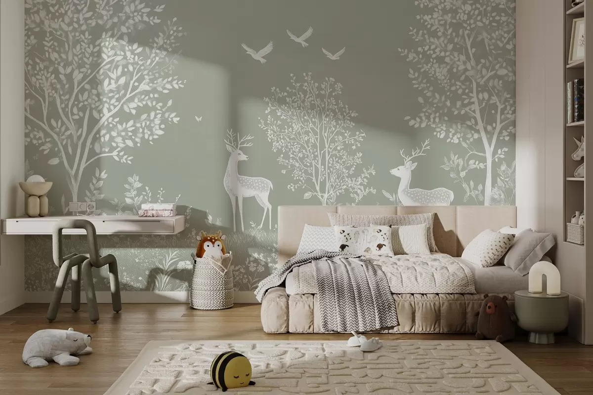 Peintures murales forêt avec des cerfs dans le style d'un dessin à la craie sur un fond olive Nr. w02444v1