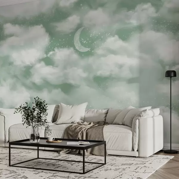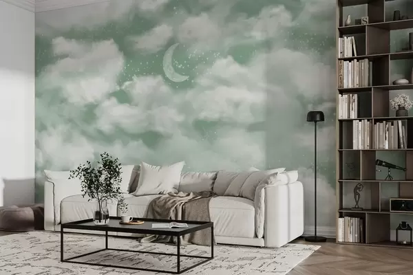 Murale Ciel étoilé avec lune et nuages, rêve, éthéré, couleurs vertes douces w02515v2
