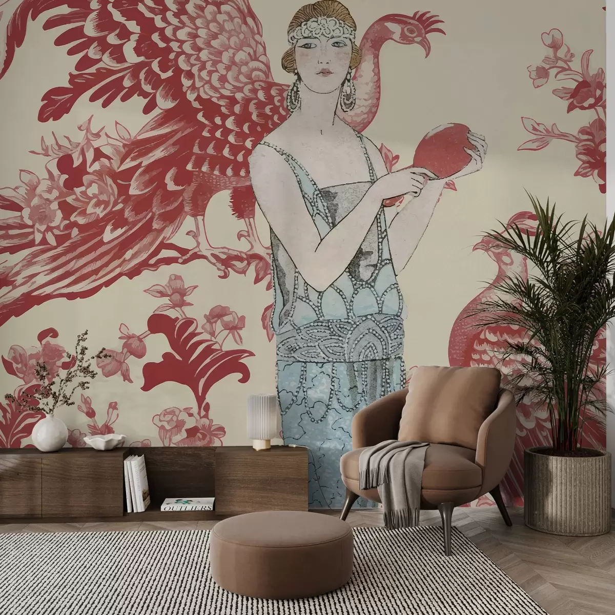 Peintures murales Élégant motif floral vintage avec une femme aux couleurs rouges Nr. w02532v1