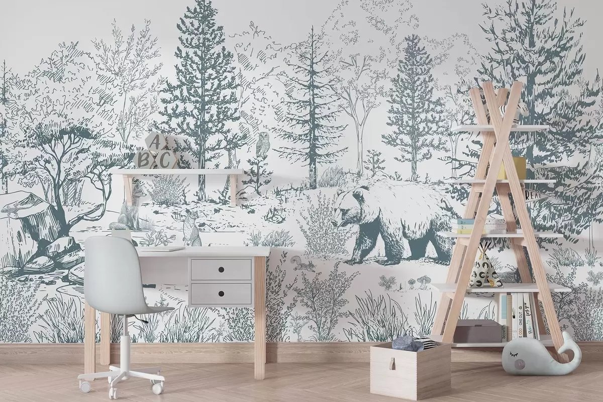 Peintures murales Vie de la forêt, arbres, animaux sauvages, ours, renard, hibou, buissons, dessin au crayon, couleurs bleues Nr. w02929v1