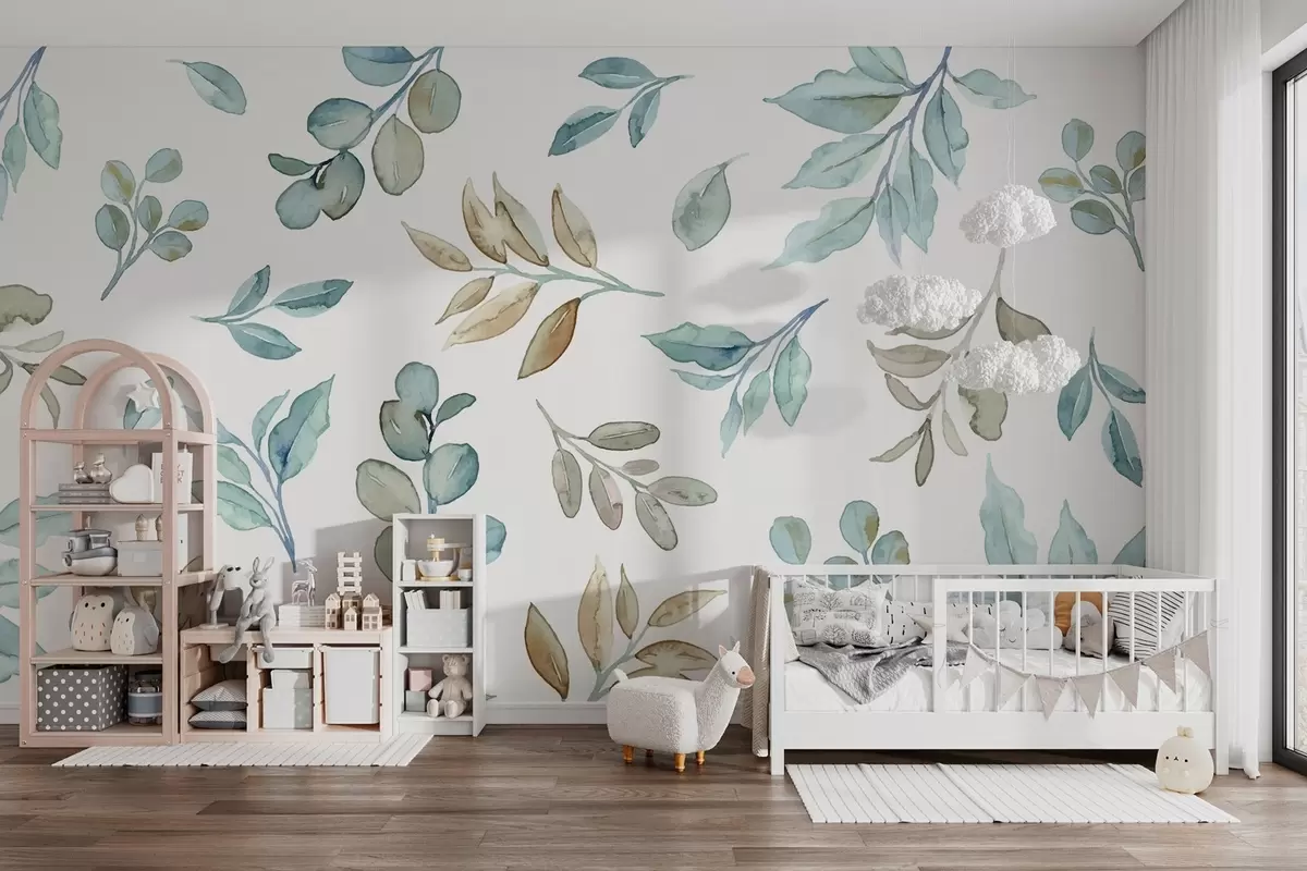 Peintures murales diverses feuilles et branches en technique d'aquarelle dans les tons bleus et beiges sur fond blanc Nr. w03280