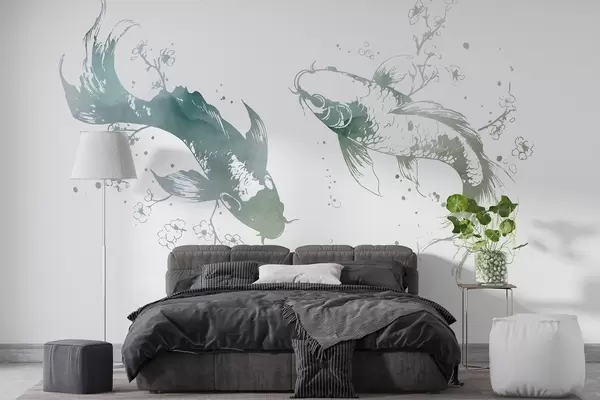 Peintures murales Aquarelle poisson, style oriental, cerisier, couleurs vertes Nr. w03447v2