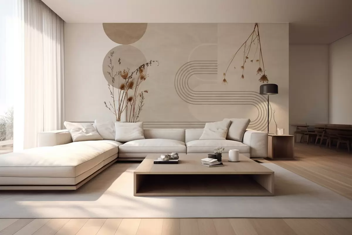 Peintures murales géométrie élégante et fleurs séchées dans les tons beiges Nr. w03449