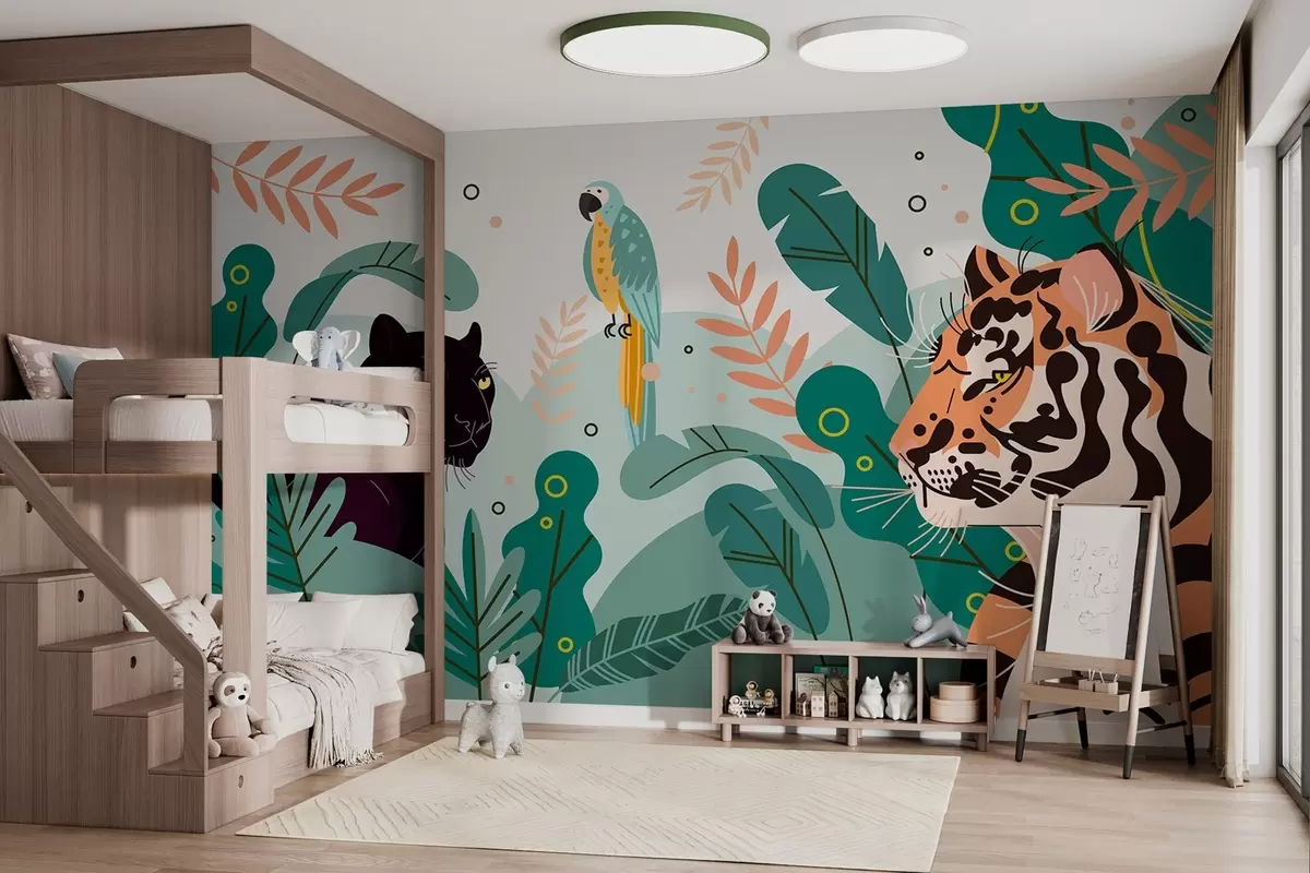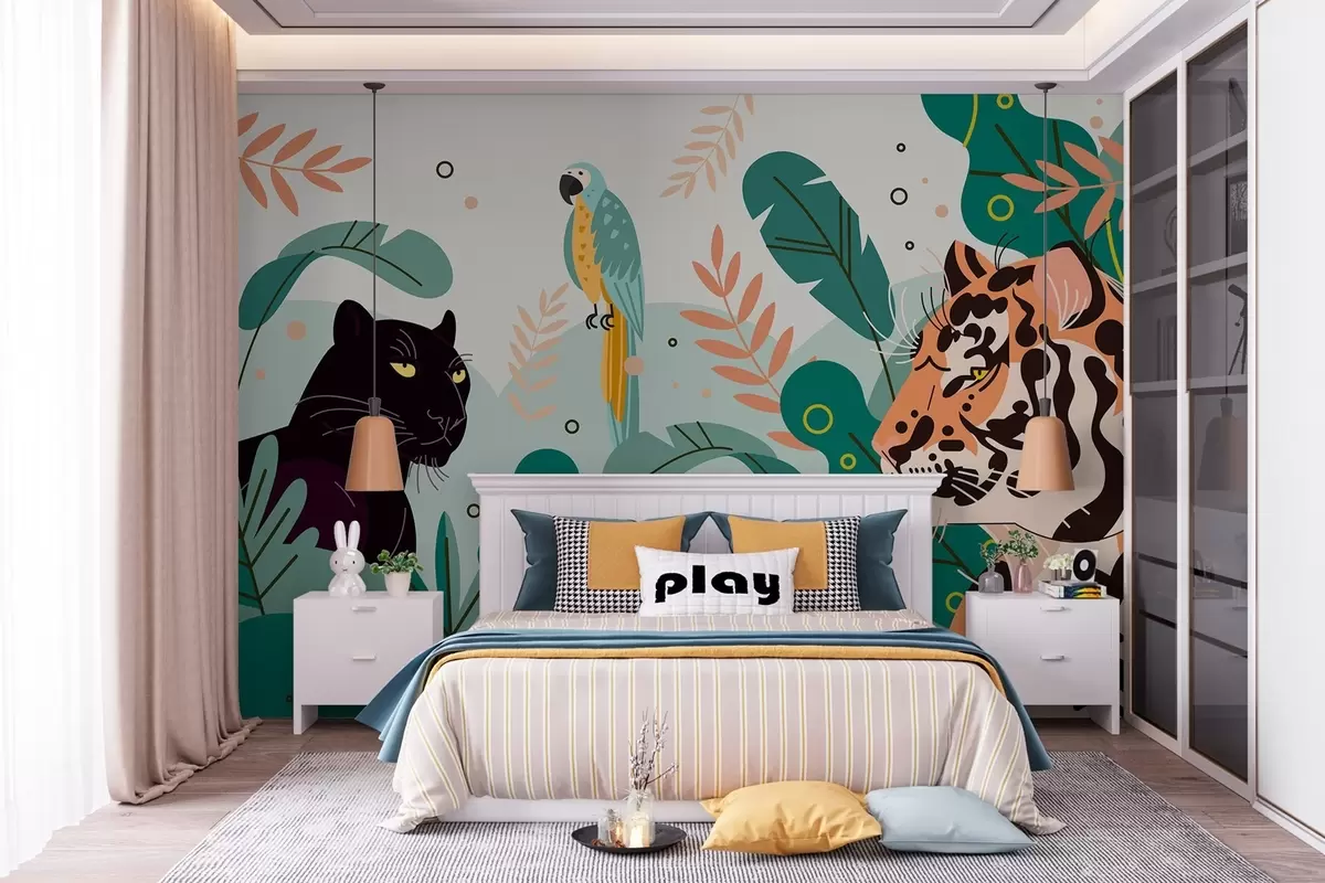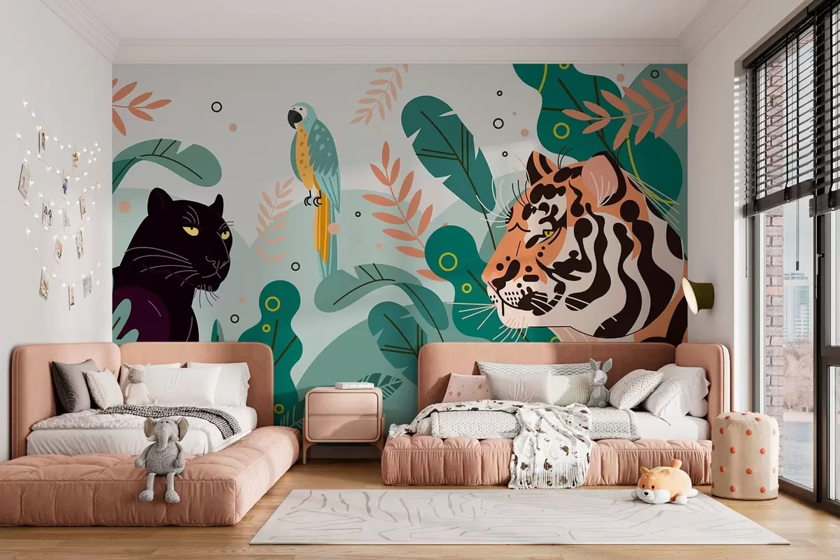 Peintures murales jungle avec un tigre, une panthère et un perroquet Nr. w03958
