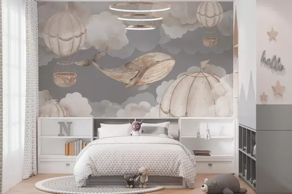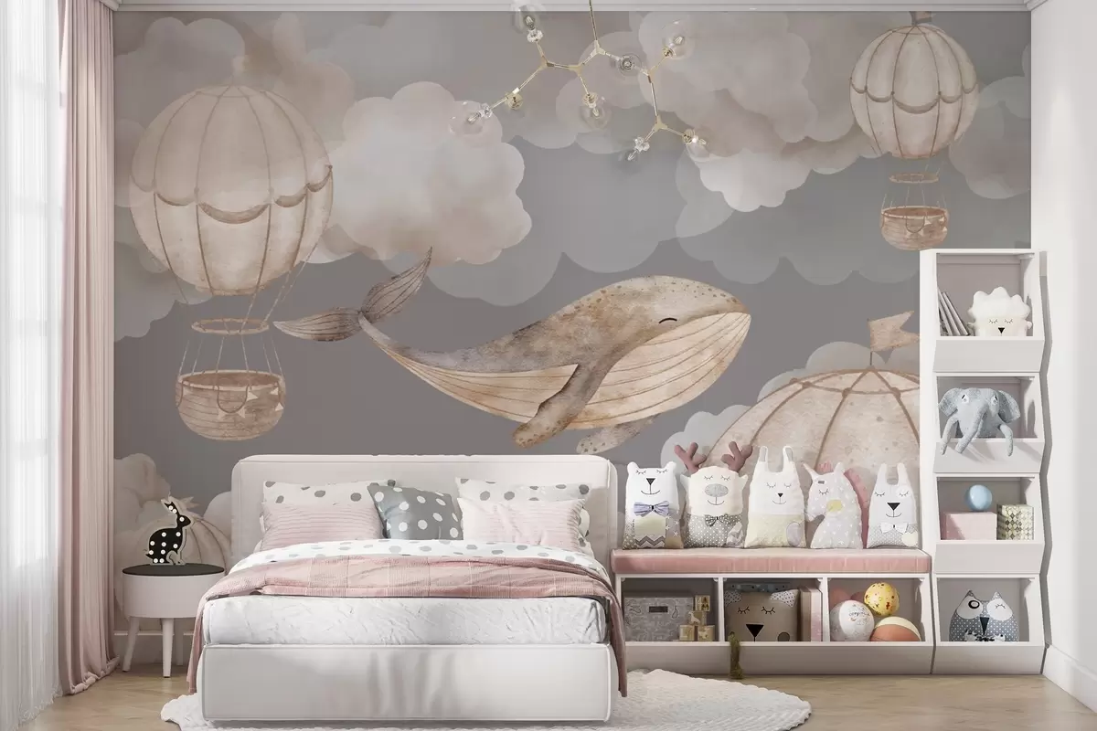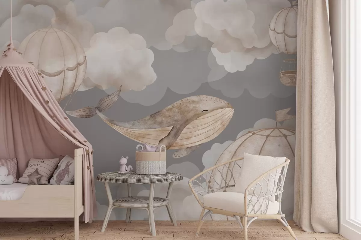 Peintures murales Baleines et montgolfières parmi les nuages cotonneux Nr. w04522