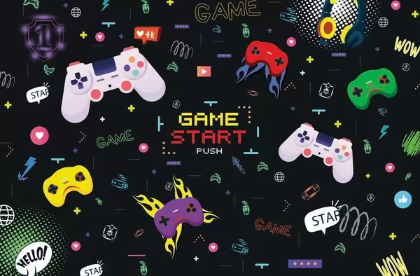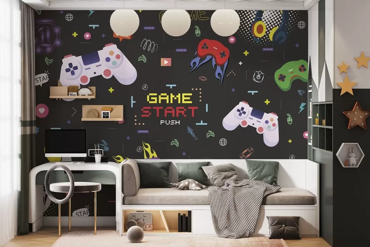 Peintures murales Motif gamer lumineux avec consoles et texte pixélisé Nr. w04581