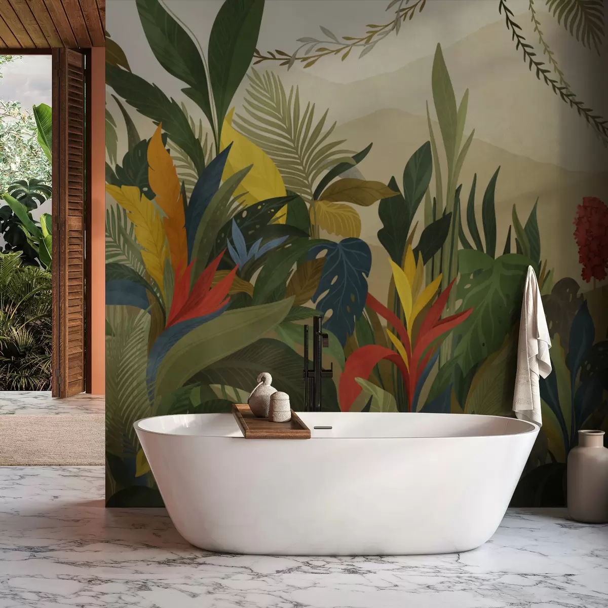 Peintures murales Feuillage tropical avec de grandes feuilles et fleurs Nr. w05019