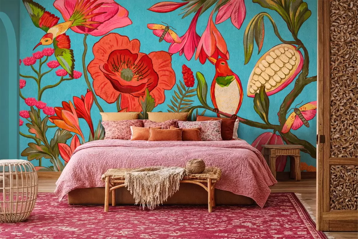 Peintures murales Fleurs et oiseaux décoratifs sur fond bleu Nr. w05036v3