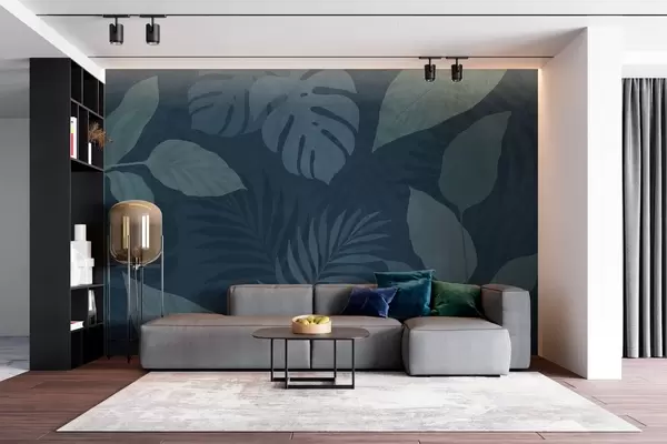 Peintures murales feuilles tropicales texturées sur fond bleu foncé Nr. w05063v3