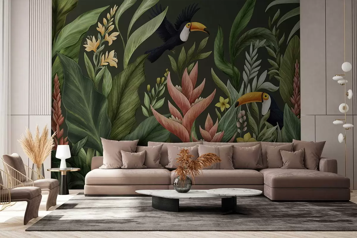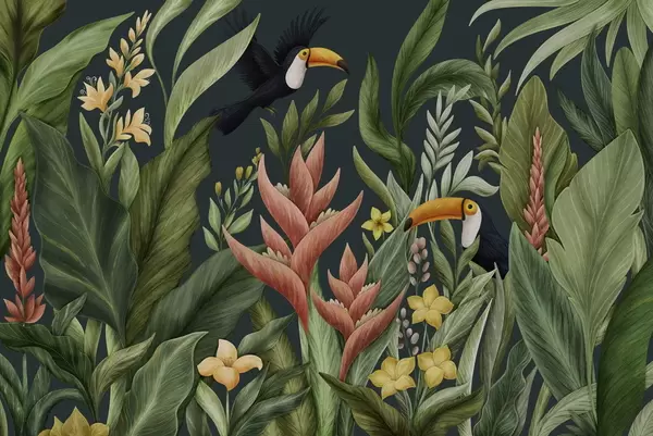 Peintures murales Plantes tropicales et oiseaux à long bec sur fond clair Nr. w05088