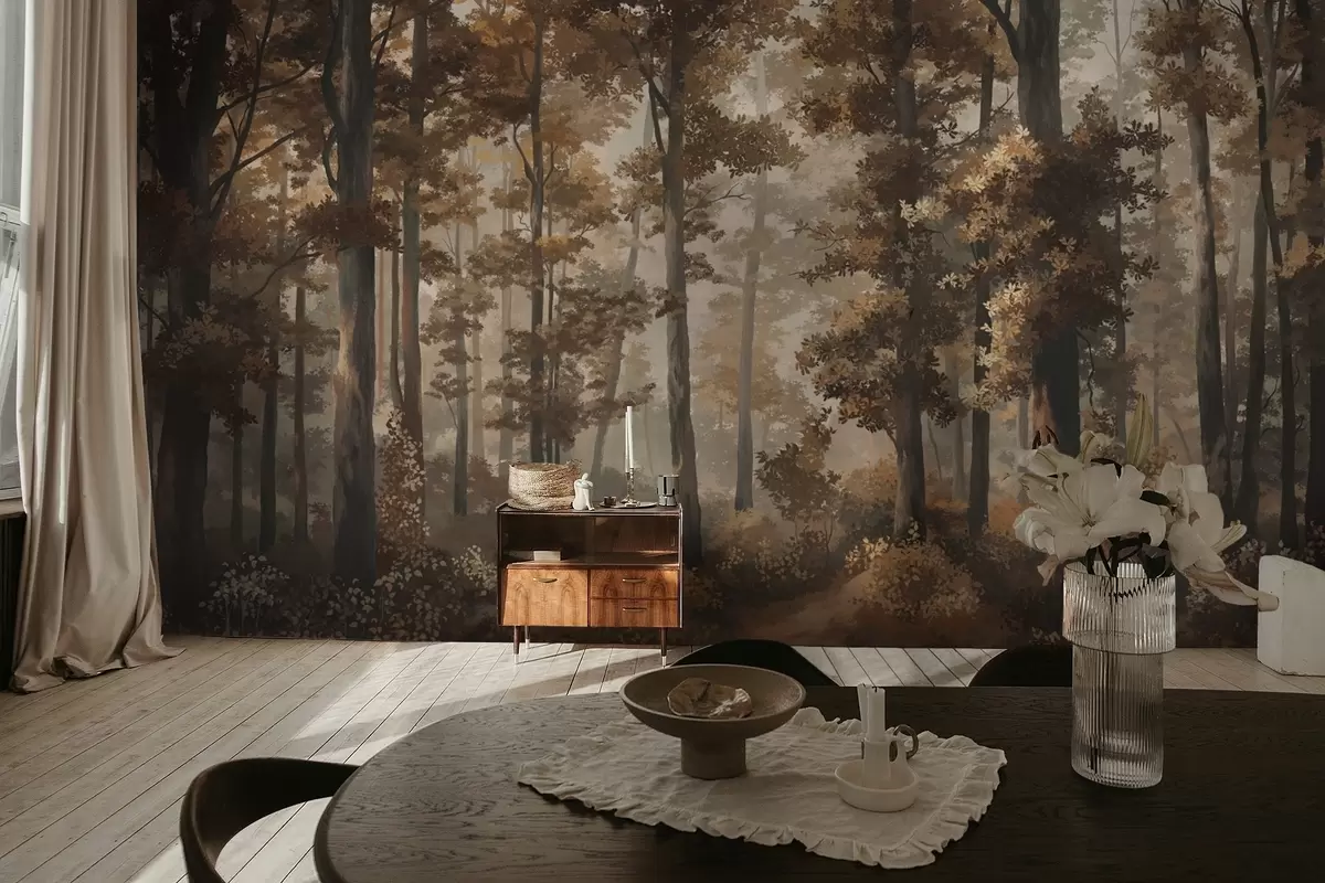 Peintures murales Scène automnale dans la forêt avec une lumière chaude et des arbres denses Nr. w05089v1