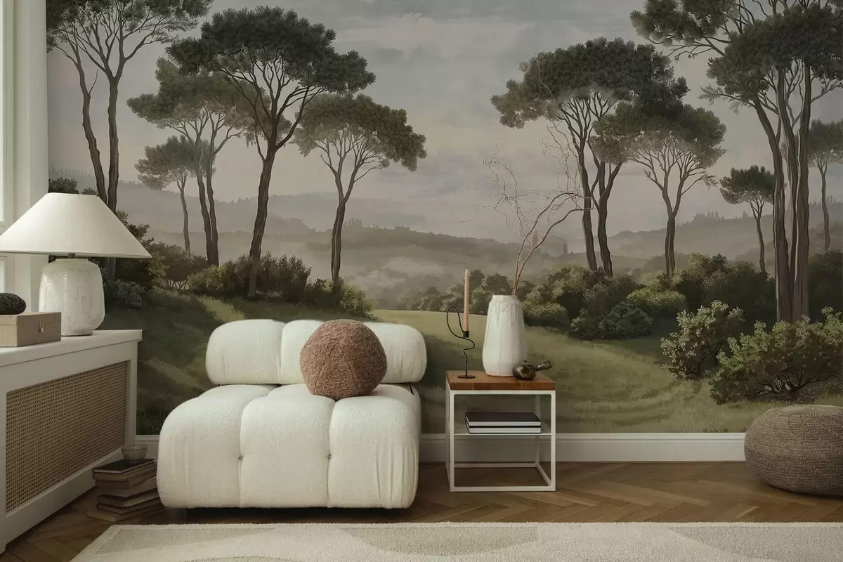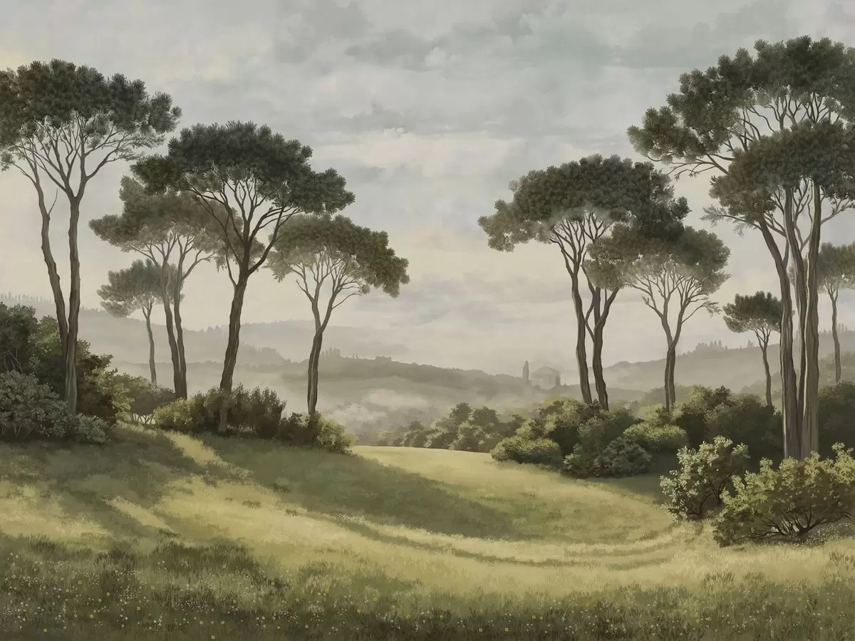 Peintures murales Paysage avec des arbres, une prairie et de la brume au loin Nr. w05122v1