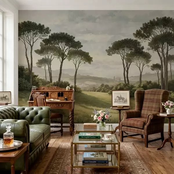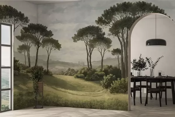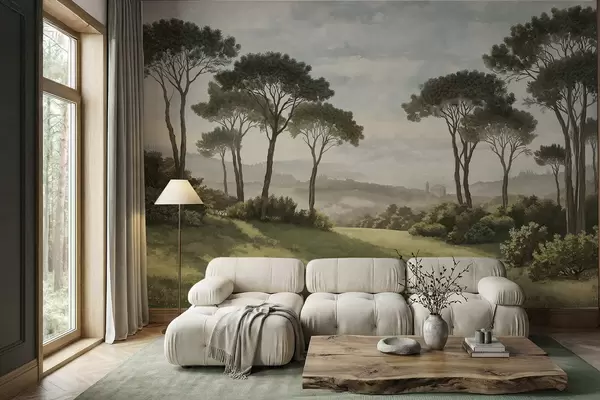 Peintures murales Paysage avec des arbres, une prairie et de la brume au loin Nr. w05122v1