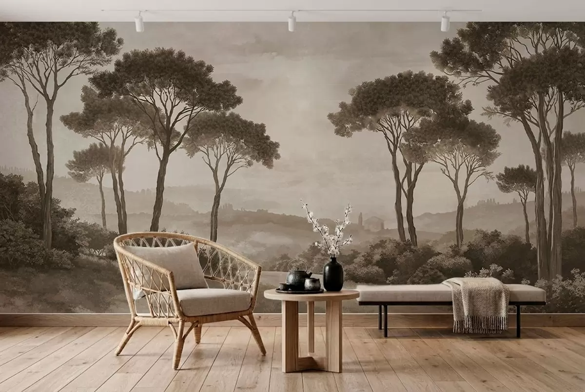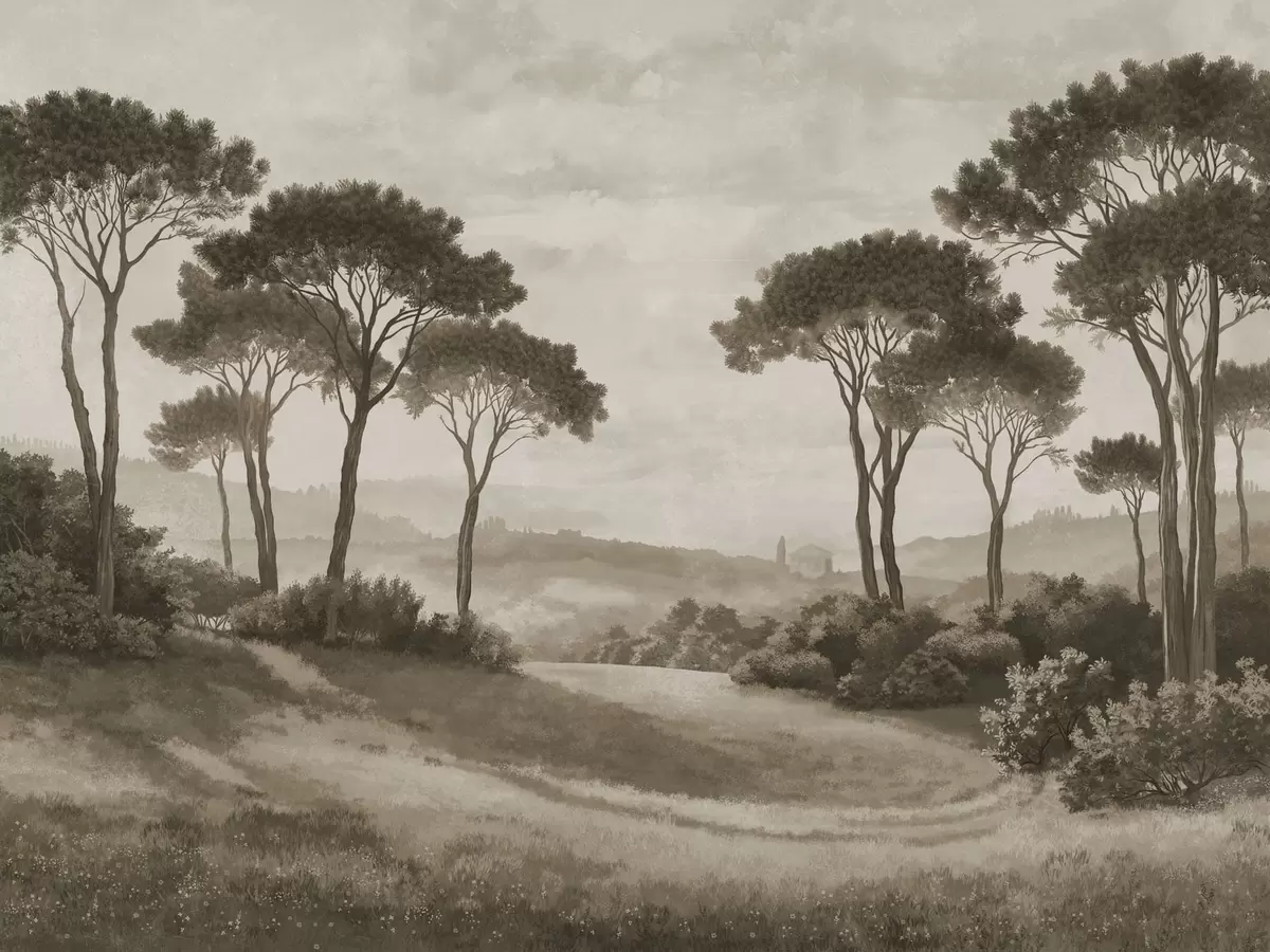 Peintures murales Paysage avec des arbres dans des tons sépia vintage Nr. w05122v2