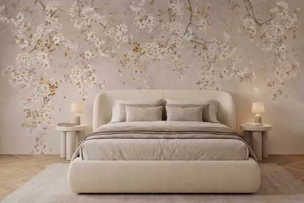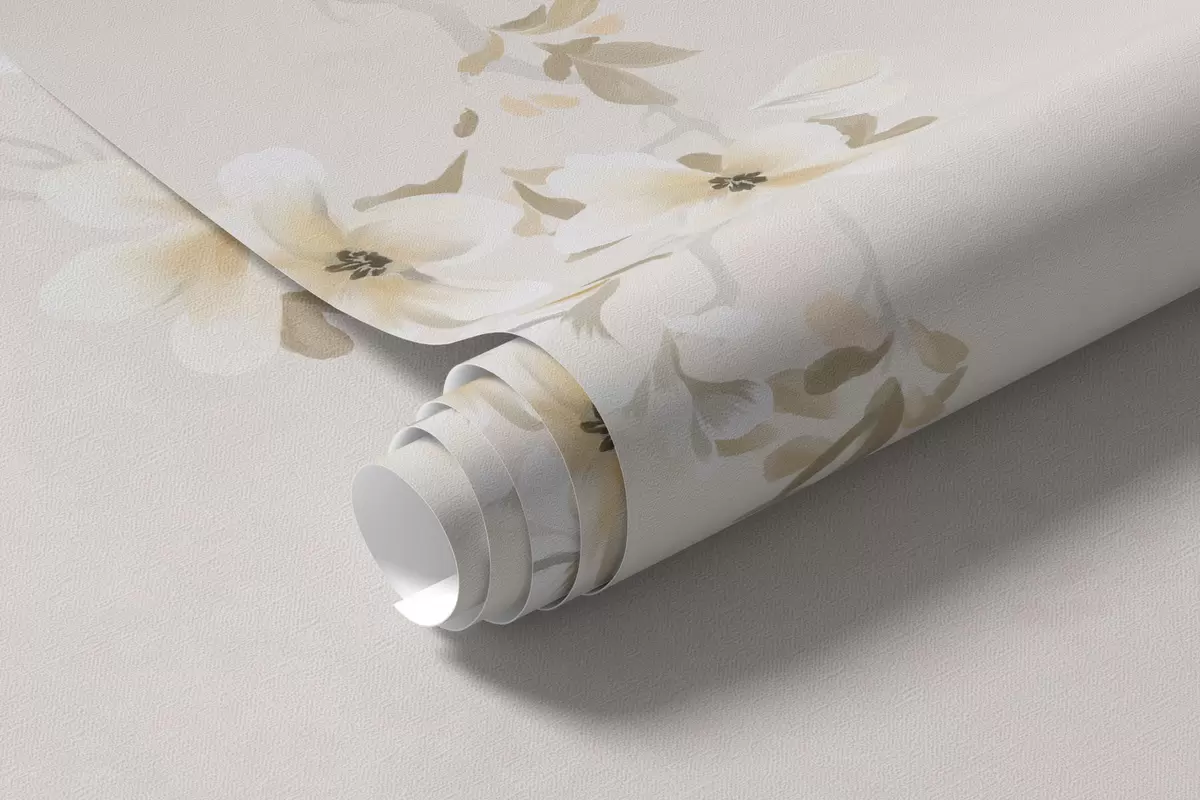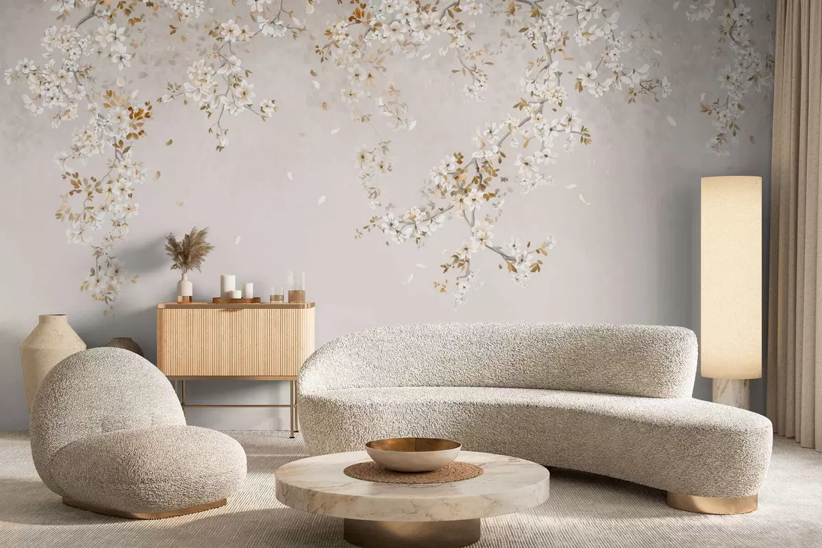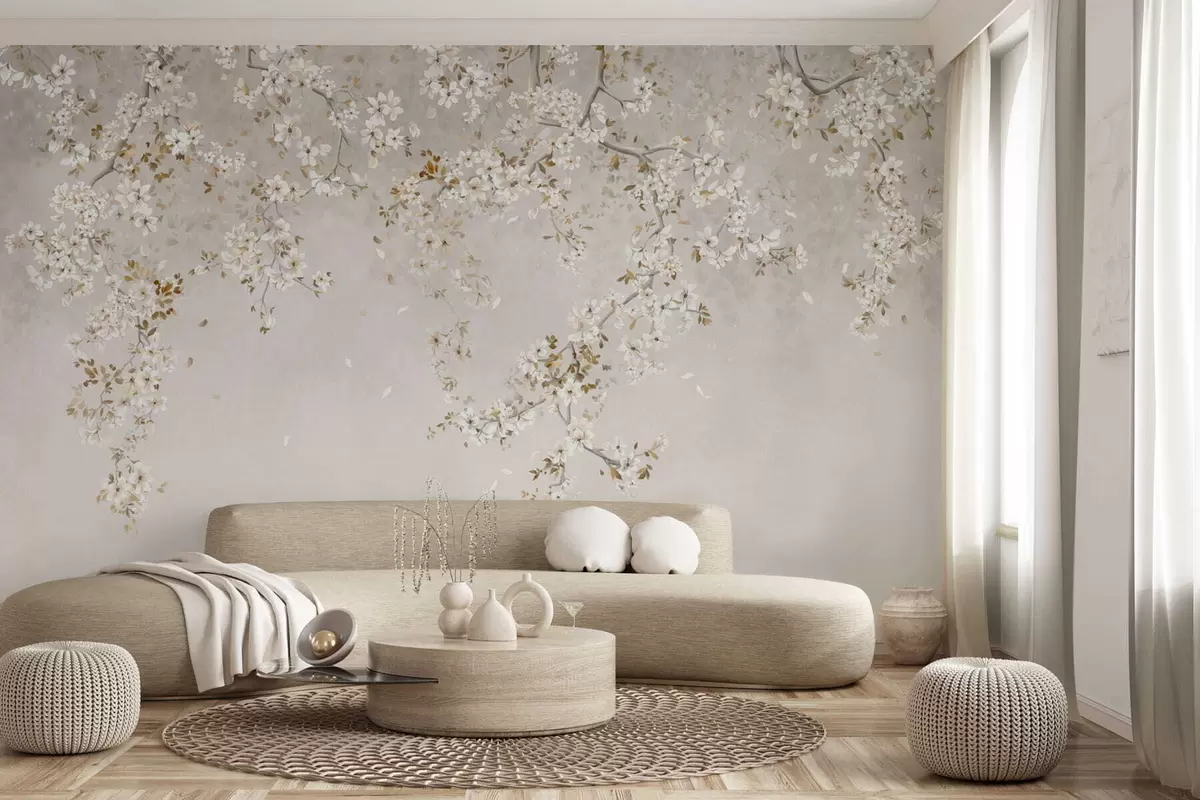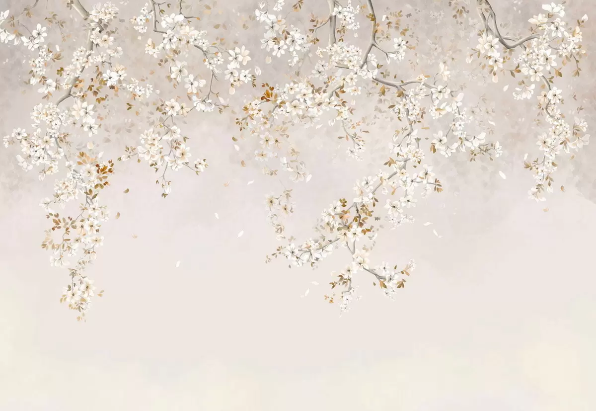 Peintures murales Branches avec des fleurs blanches sur un fond beige clair Nr. w05129