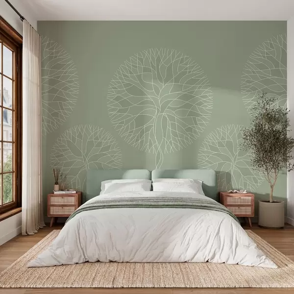 Peintures murales Arbres fantaisistes linéaires aux couronnes luxuriantes dans des tons vert clair Nr. w05213v6