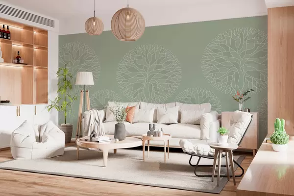 Peintures murales Arbres fantaisistes linéaires aux couronnes luxuriantes dans des tons vert clair Nr. w05213v6