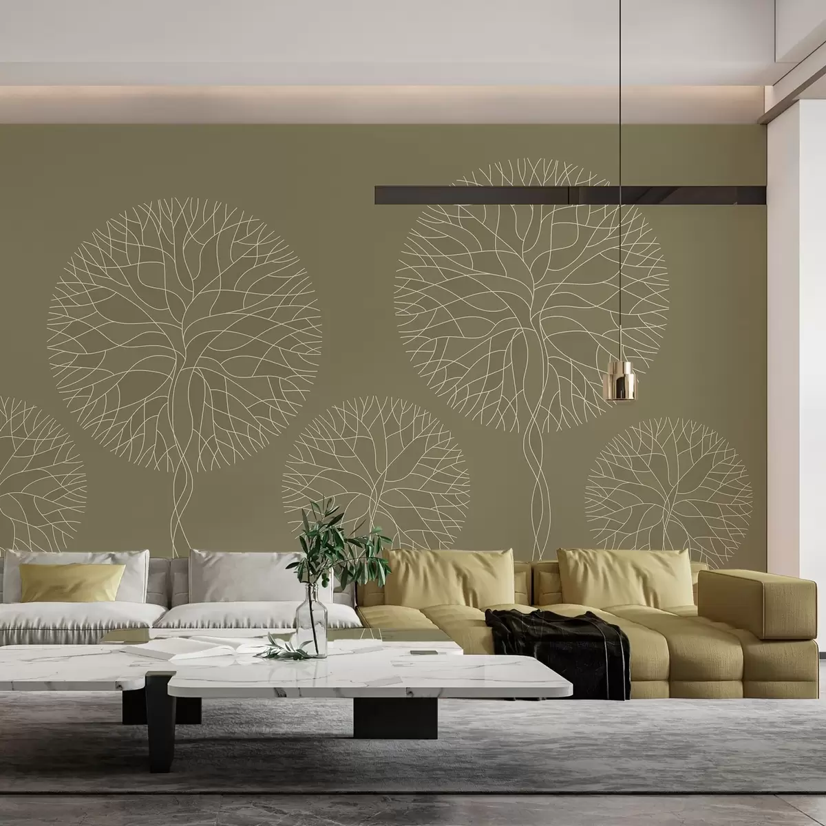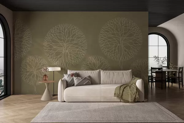Peintures murales Arbres fantaisistes linéaires aux couronnes luxuriantes dans des tons kaki Nr. w05213v7