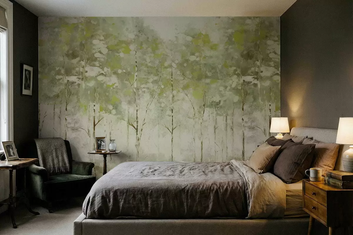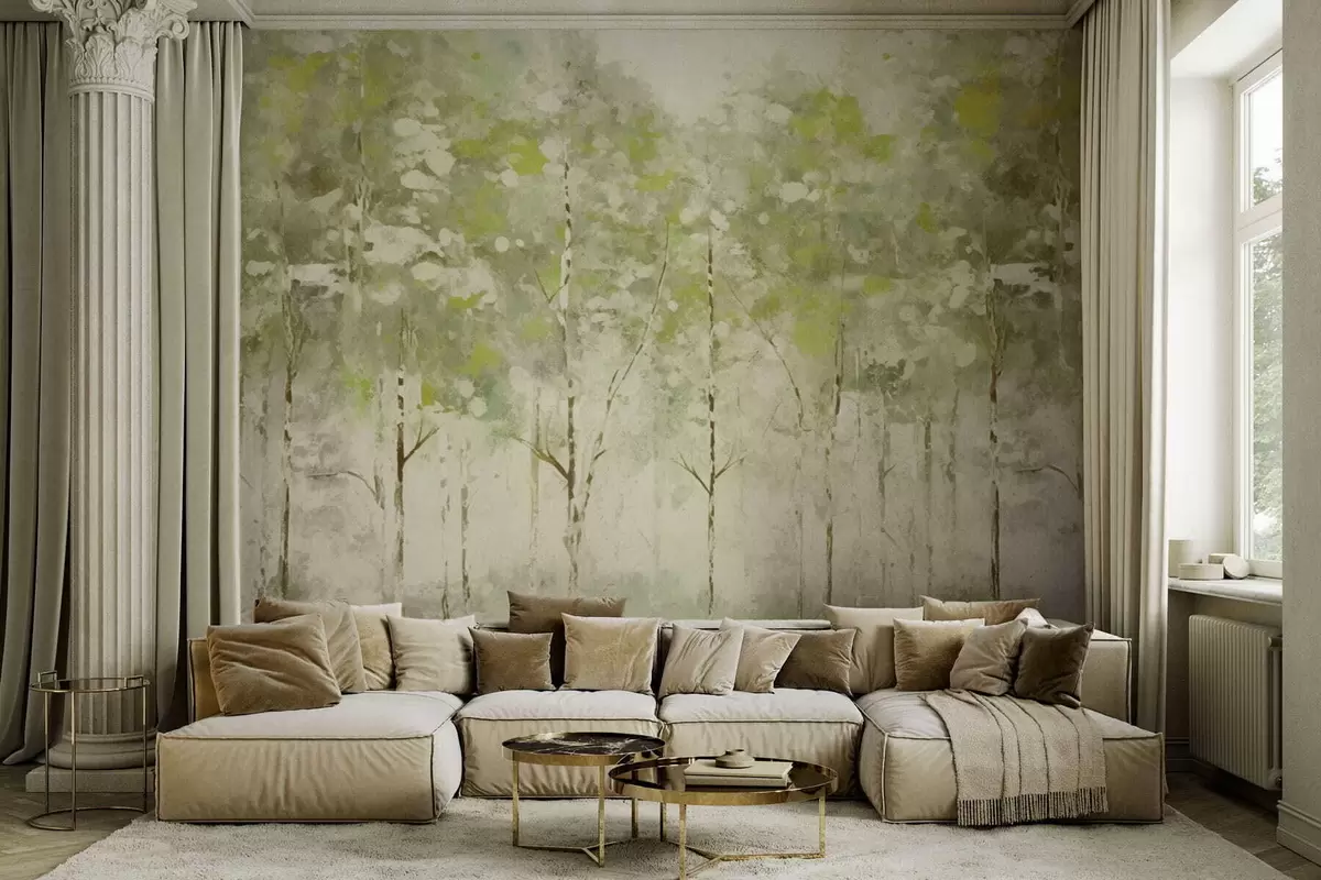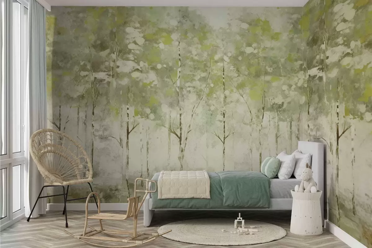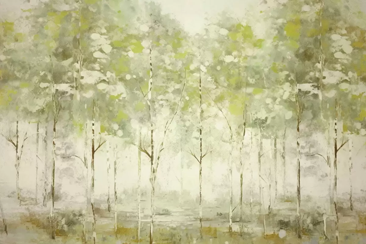 Peintures murales Forêt stylisée avec des arbres élancés dans des tons verts Nr. w05221v1
