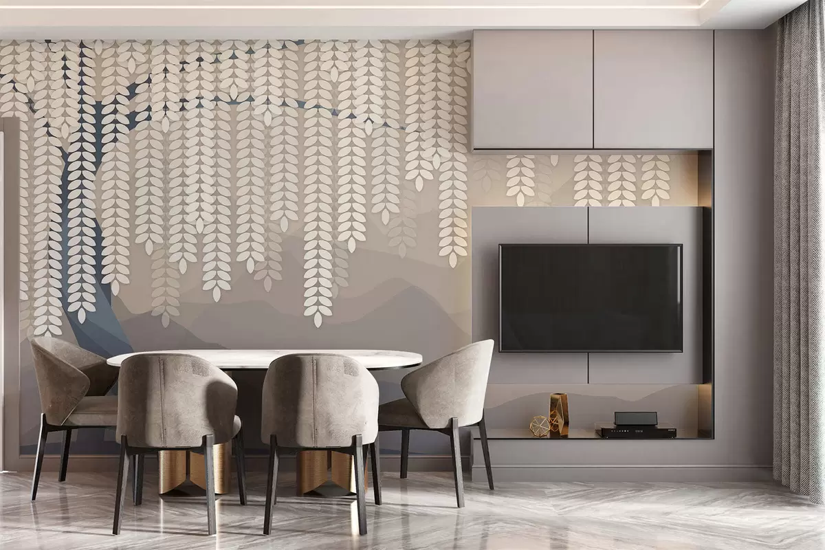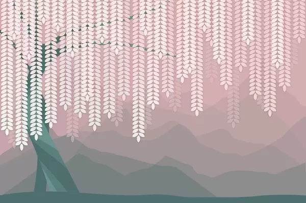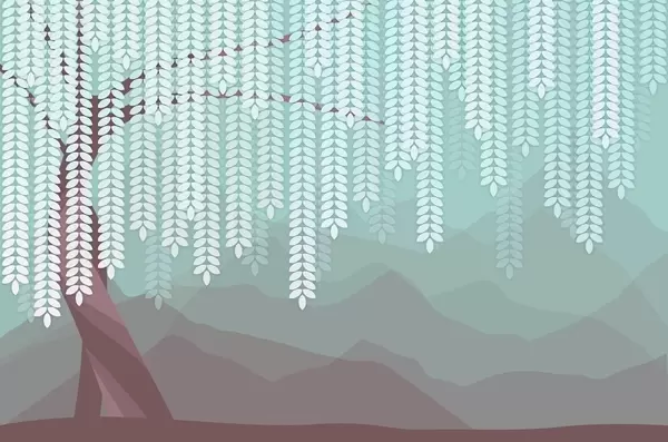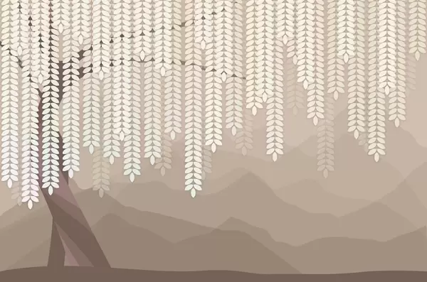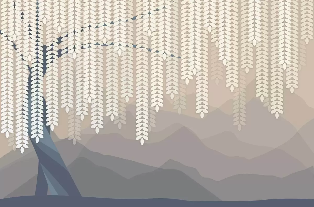 Peintures murales Saule stylisé aux feuilles pendantes sur fond de montagnes minimalistes dans des tons beige et bleu-vert. Nr. w05232