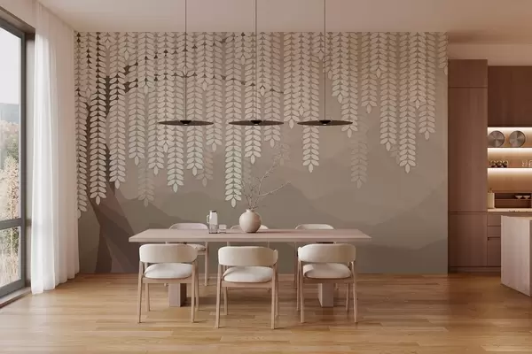 Peintures murales Saule stylisé avec des feuilles pendantes sur fond de montagnes minimalistes dans des tons café. Nr. w05232v2