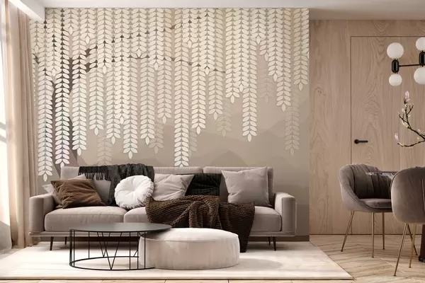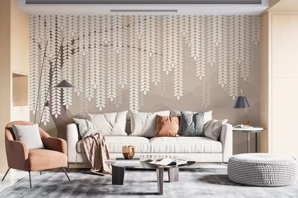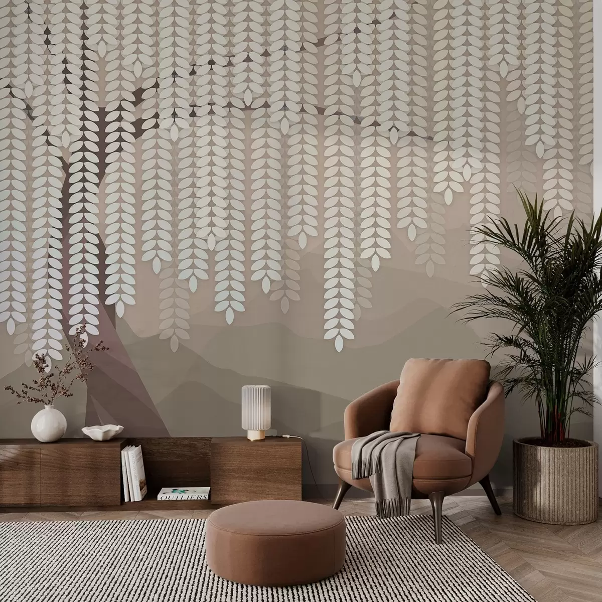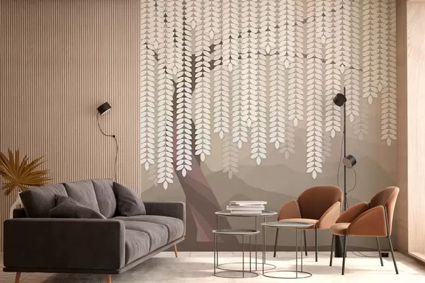 Murale Saule stylisé avec des feuilles pendantes sur fond de montagnes minimalistes dans des tons café. w05232v2